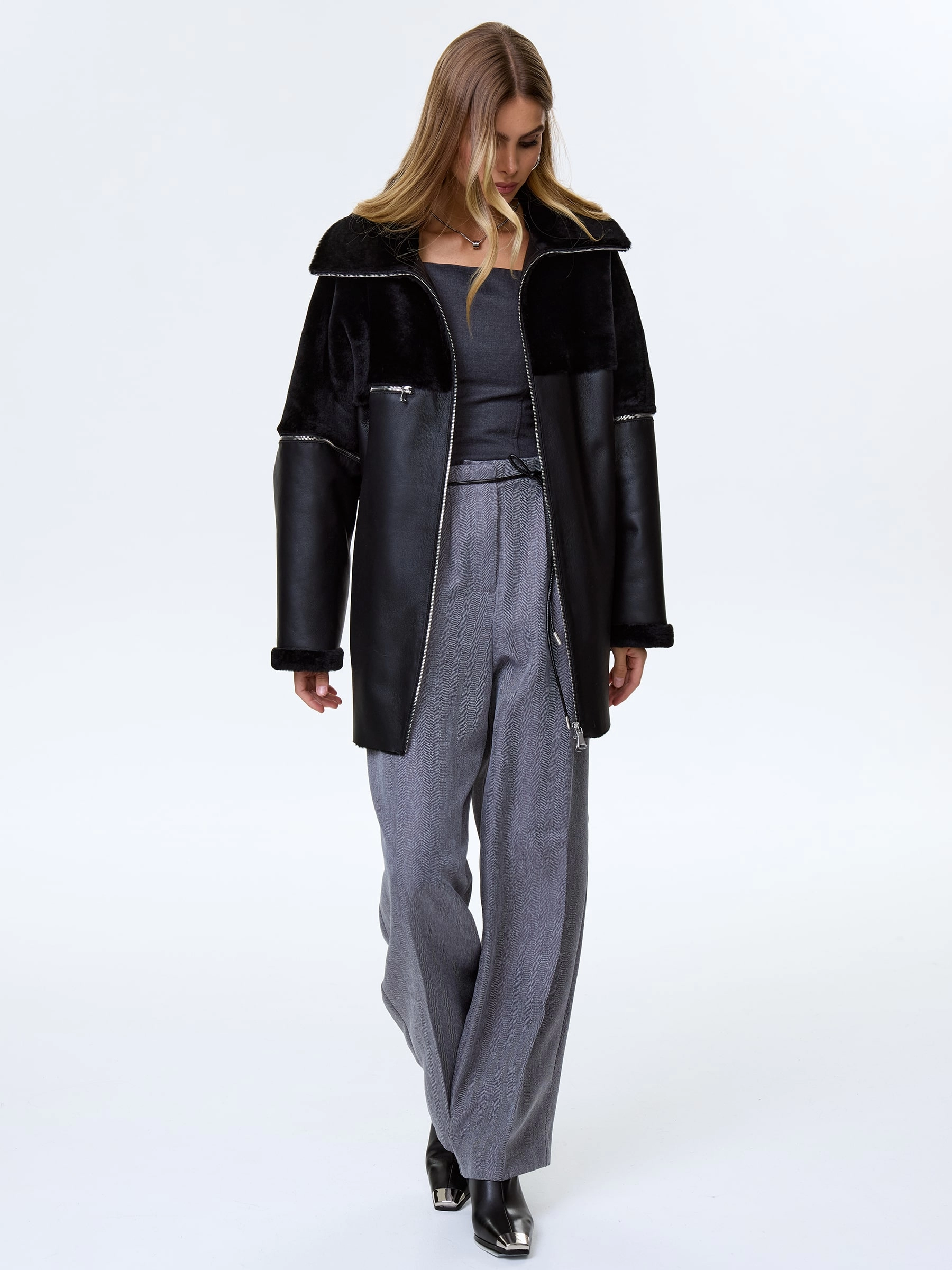 Это полупальто выполнили из натуральной стриженной овчины. Свободный крой, высокий воротник-стойка легко трансформируется в отложной. Изменить модель можно при помощи отстегивающихся рукавов. Карманы как и само изделие застегиваются молниями.