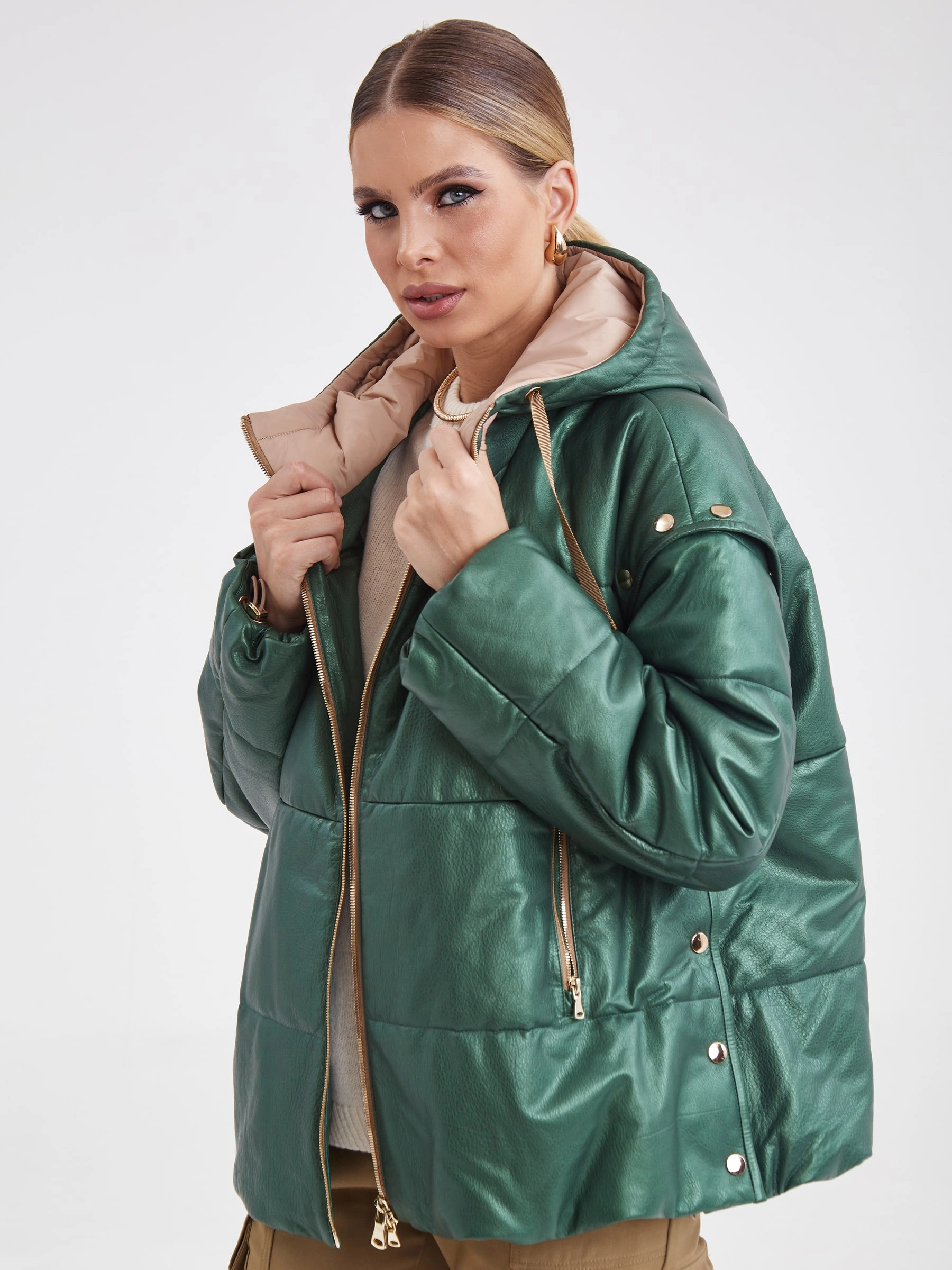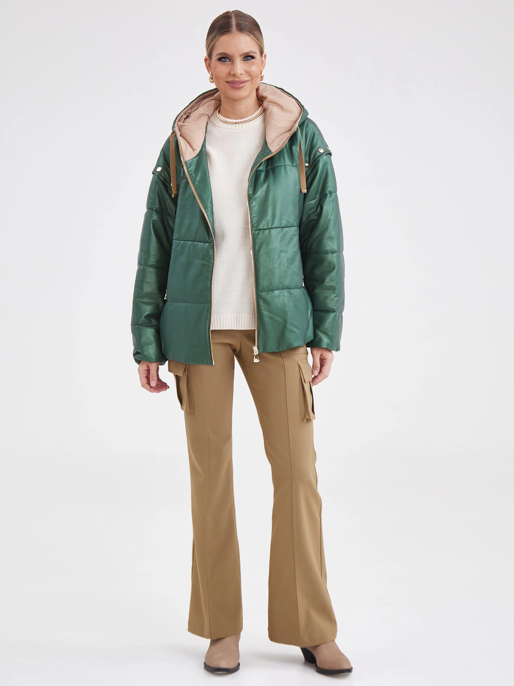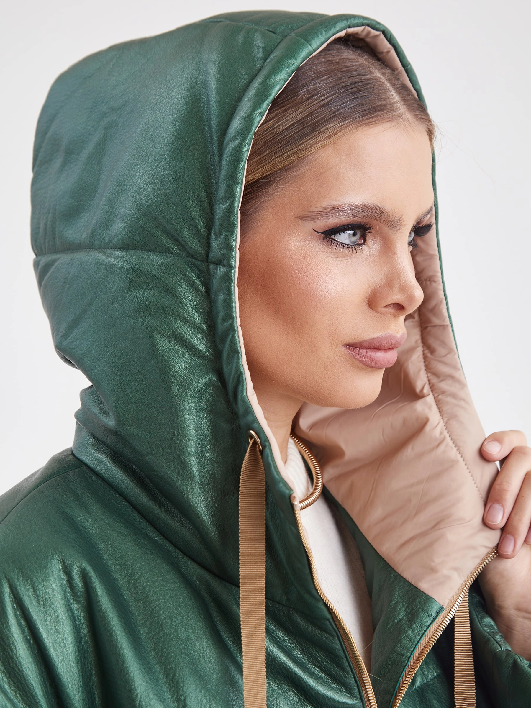 Утепленная женская кожаная куртка оверсайз с капюшоном премиум класса 3023, зеленая, размер 52, артикул 23330