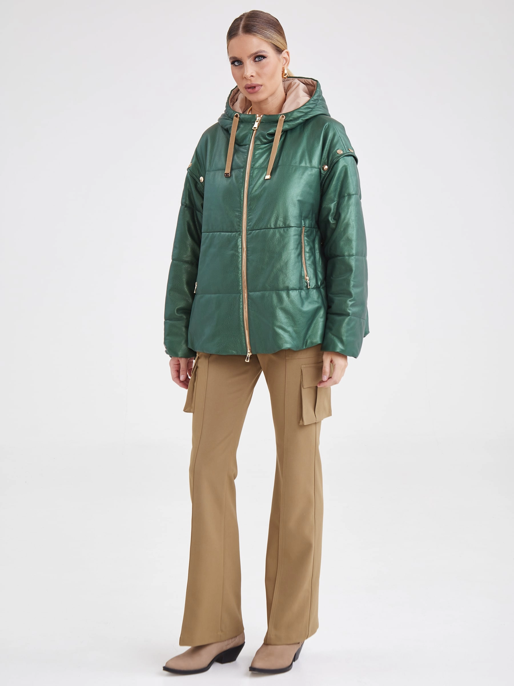 Товар утепленная женская кожаная куртка оверсайз с капюшоном премиум класса 3023, зеленая, размер 52, артикул 23330 выполнен из натуральной кожи с застежкой молния. Рассчитан на сезон: демисезон. Длина изделия 51-74 см, силуэт свободный.