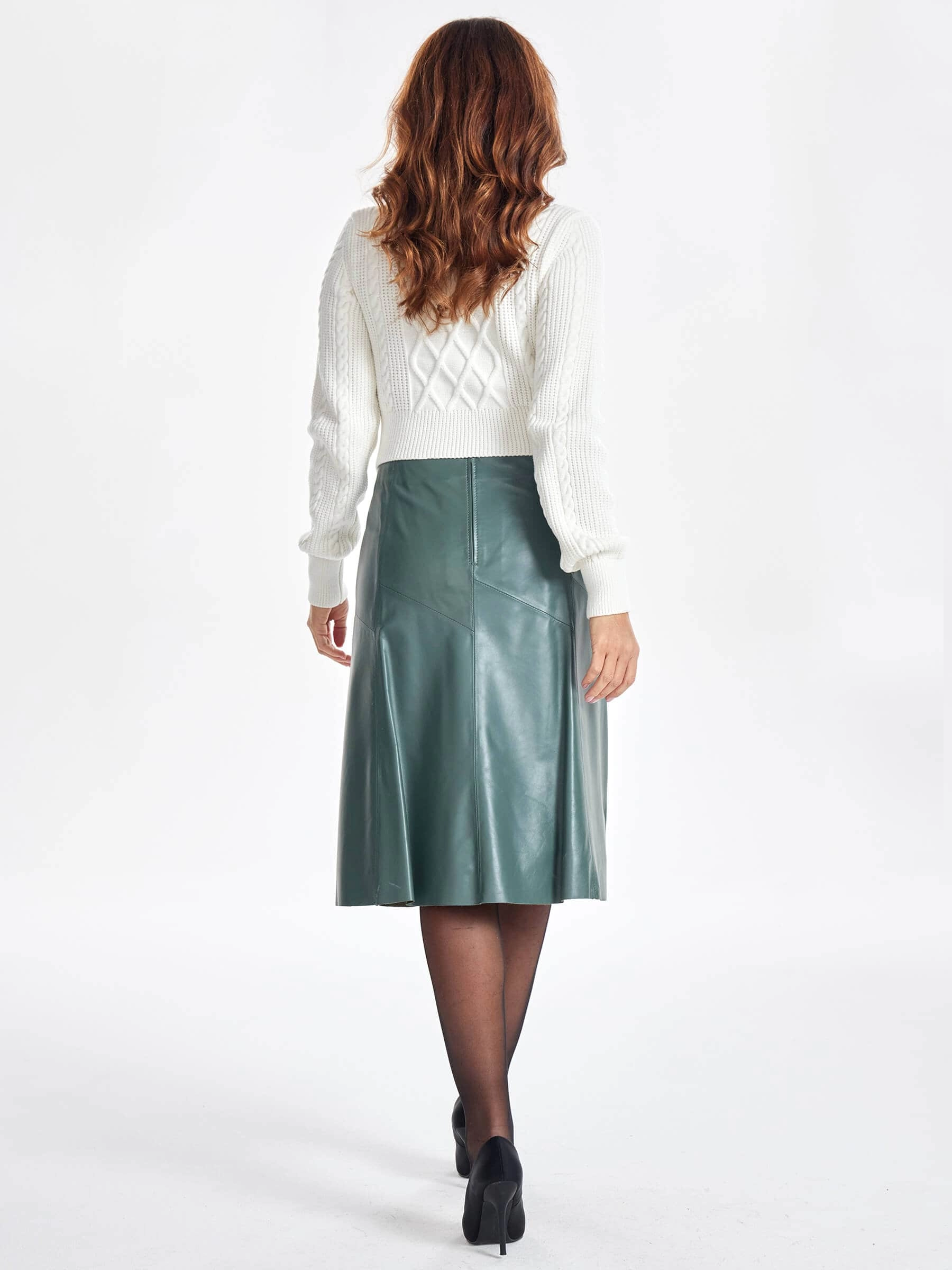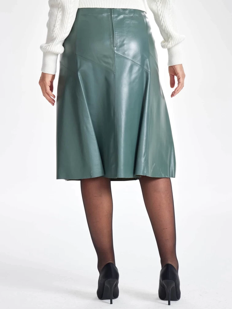 Стильная юбка из натуральной кожи с заниженной талией без пояса сочетает изысканность с современной дерзостью, демонстрируя идеально гладкую пластичную кожу премиального качества, которая облегает бёдра и мягко расклешёвывается книзу благодаря элегантным вставкам-годе, создавая при каждом шаге эффектный струящийся объём. Потайная молния на спинке обеспечивает удобство и сохраняет чистоту линий, а универсальный дизайн делает модель идеальной для создания разнообразных образов — от офисных до вечерних. Эта юбка легко сочетается с базовыми топами, классическими лодочками, модными кроссовками или изысканными аксессуарами, сохраняя все преимущества натуральной кожи: пластичность, комфорт и благородный блеск, что делает её прекрасным выбором для города, работы и особых случаев.