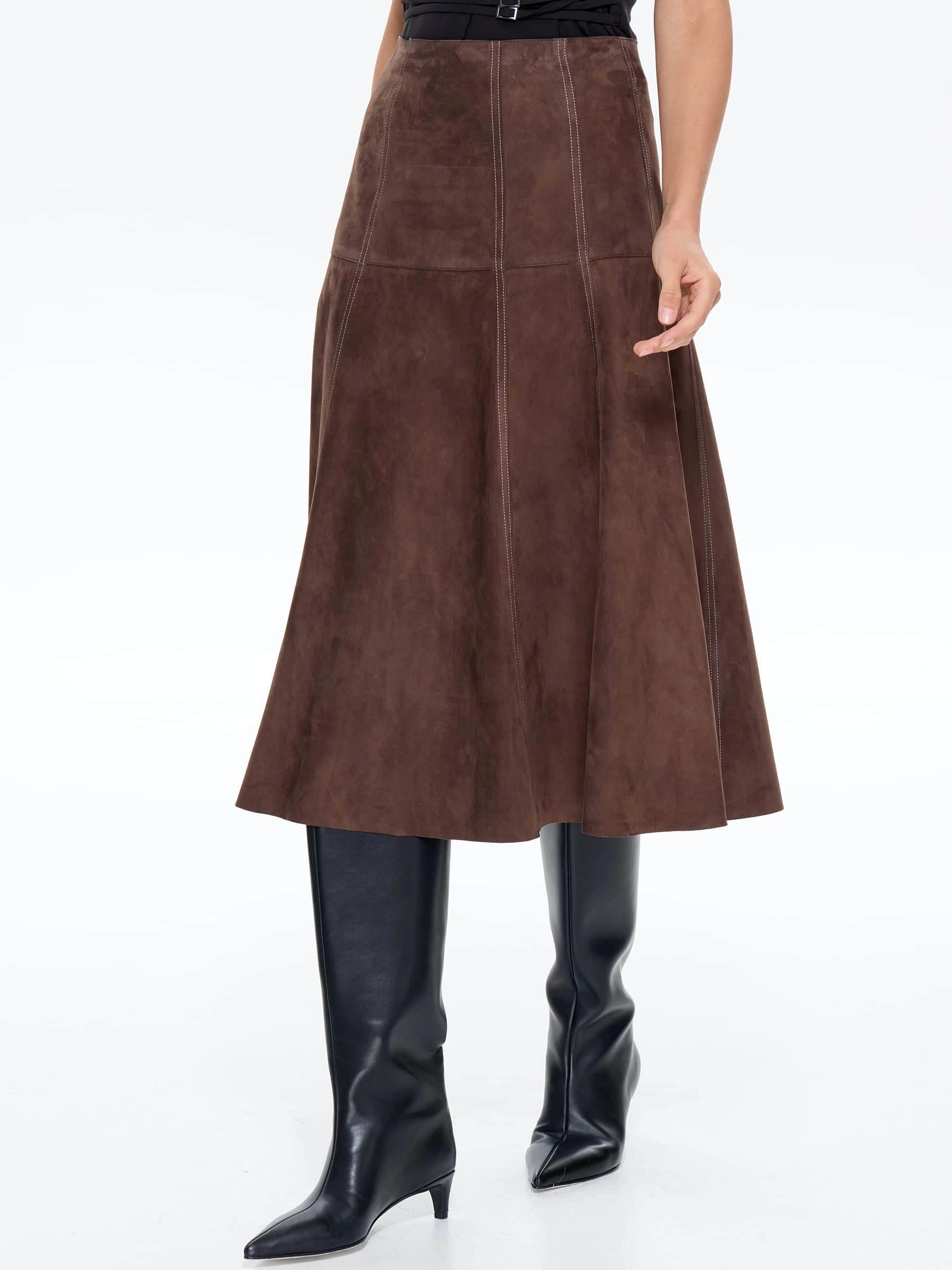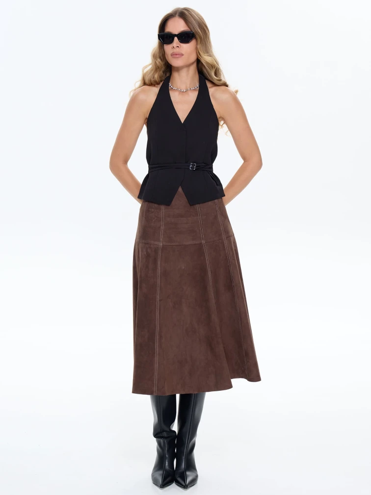 Юбка-миди из мягкой натуральной замши в насыщенном светло-коричневом цвете с контрастной отстрочкой сочетает полуприлегающий крой с элегантным клешем. Контрастная строчка и потайная застежка добавляют модели изысканности, а универсальный оттенок делает ее идеальной для создания разных образов — от повседневных с объемными свитерами до вечерних с шелковыми блузами. Качественная замша гарантирует комфорт и долговечность.