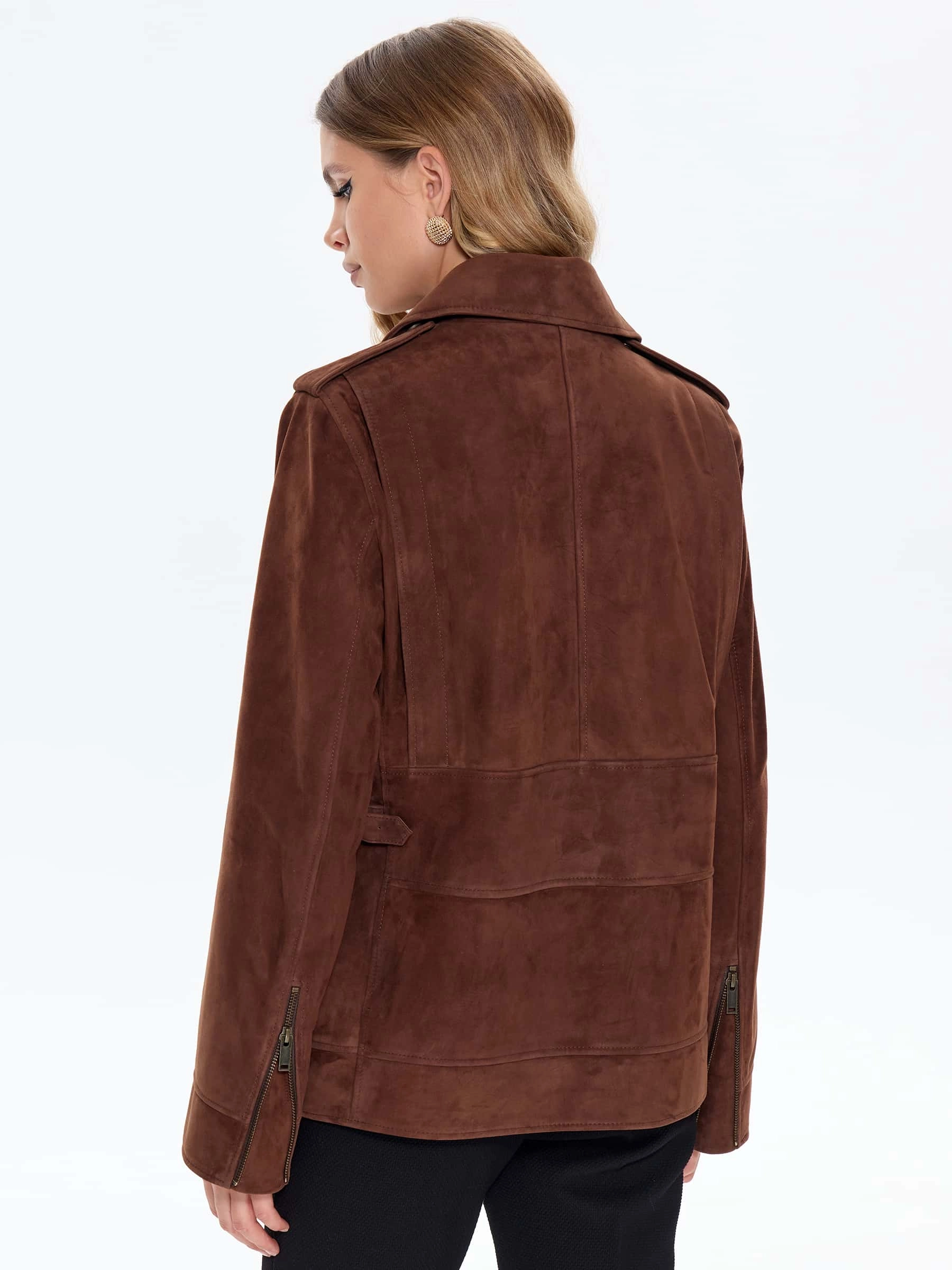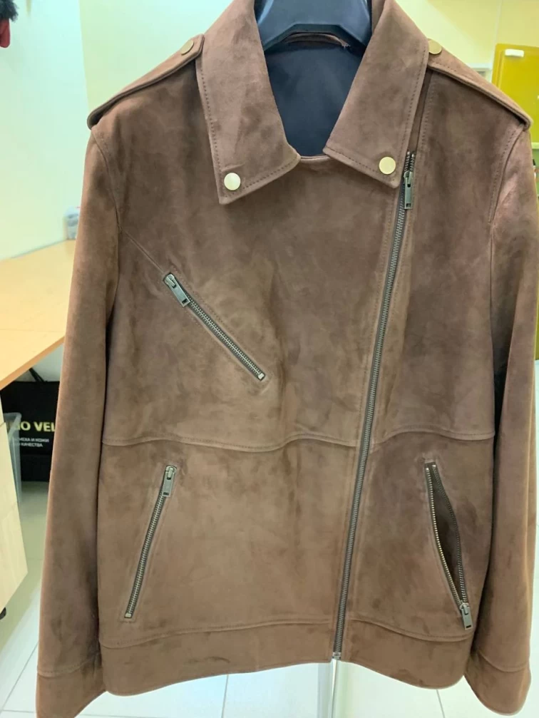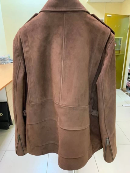 Удлиненную косуху выполнили из замши премиум класса. Прямой крой с втачными рукавами дополнили погонами. Прорезные карманы и манжеты застегиваются крупными молниями. Великолепная посадка по фигуре и свободе движений.