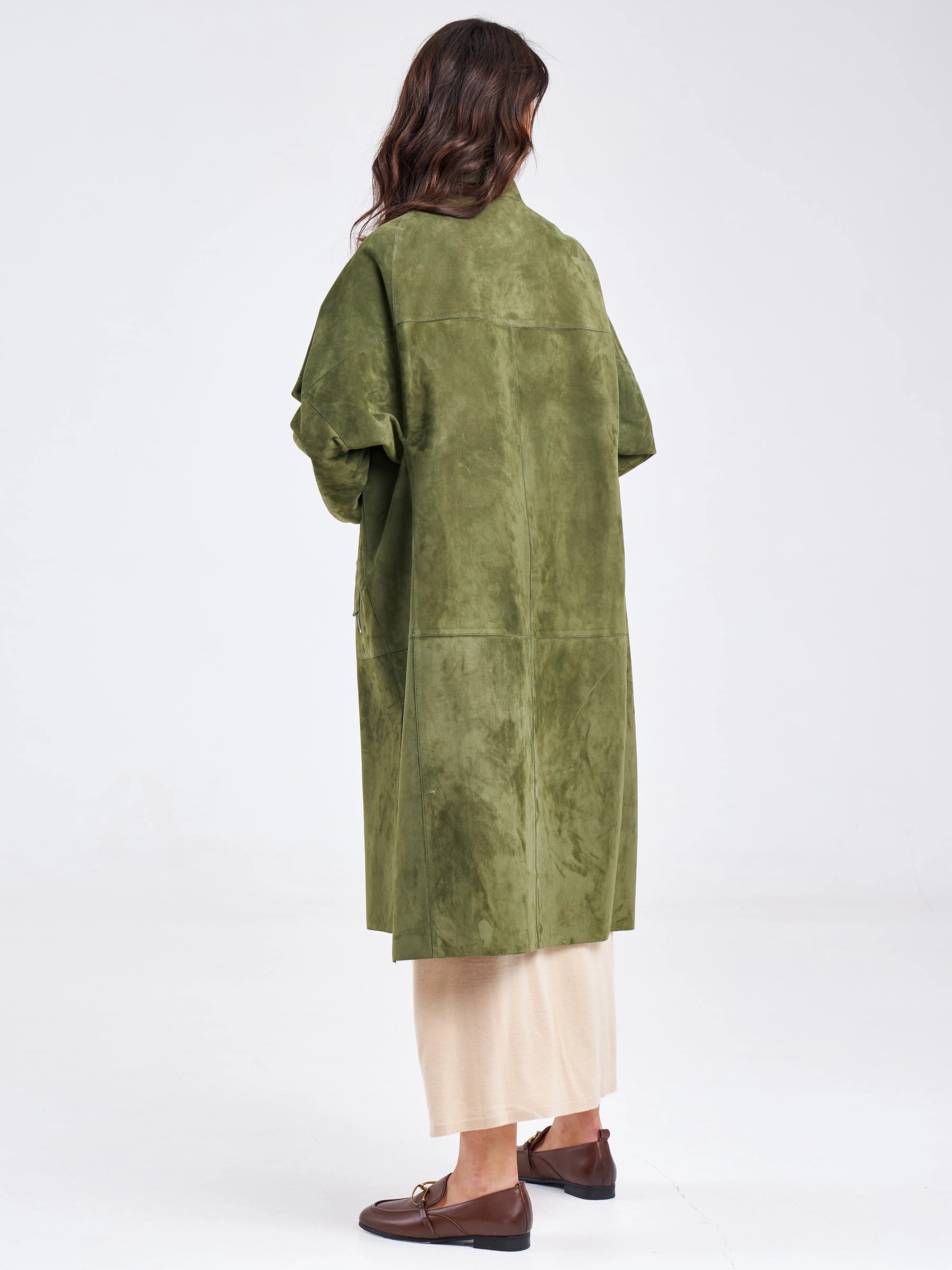 Замшевый женский плащ на молнии премиум класса 3041, хаки, размер 46, артикул 91910