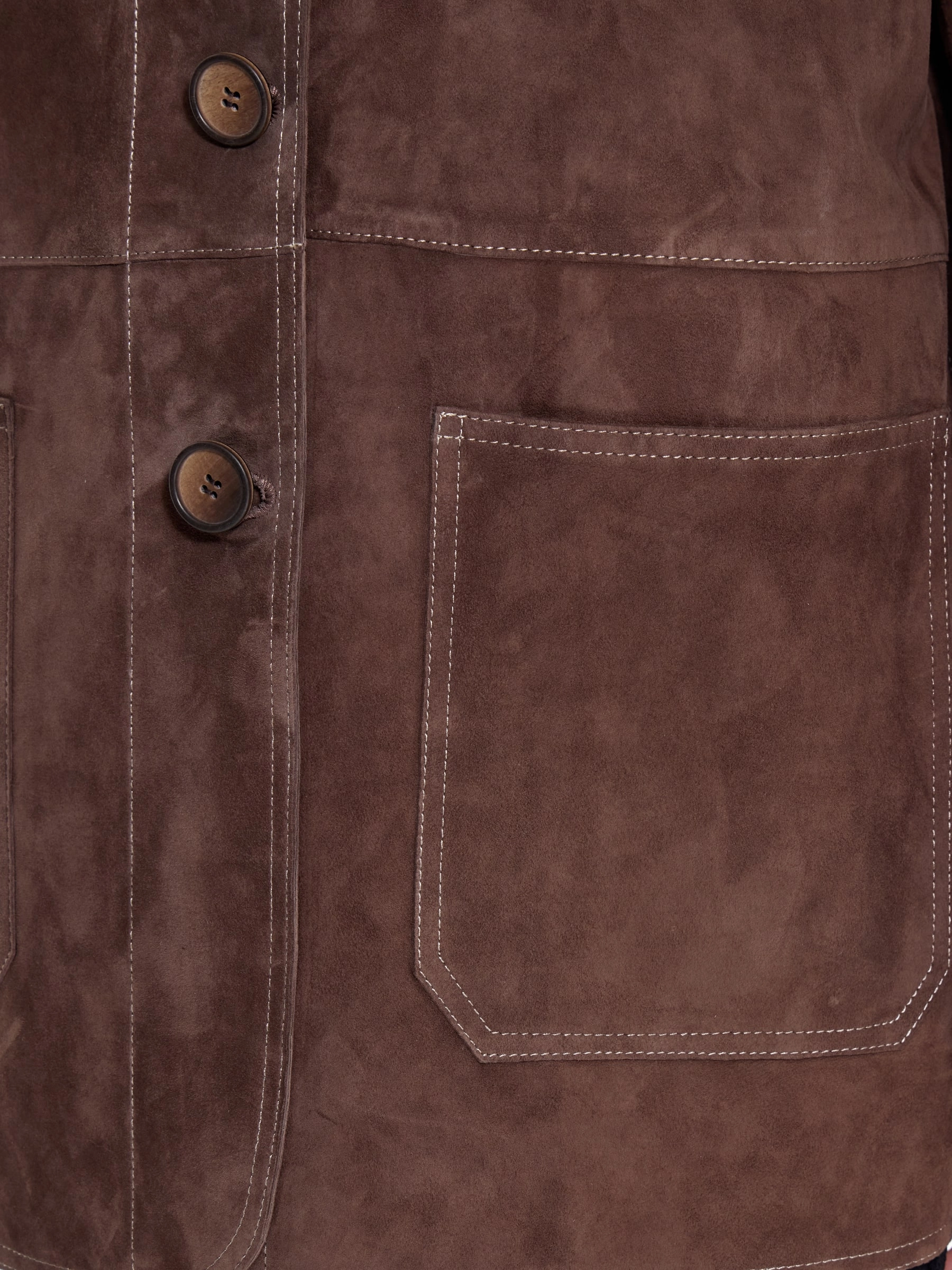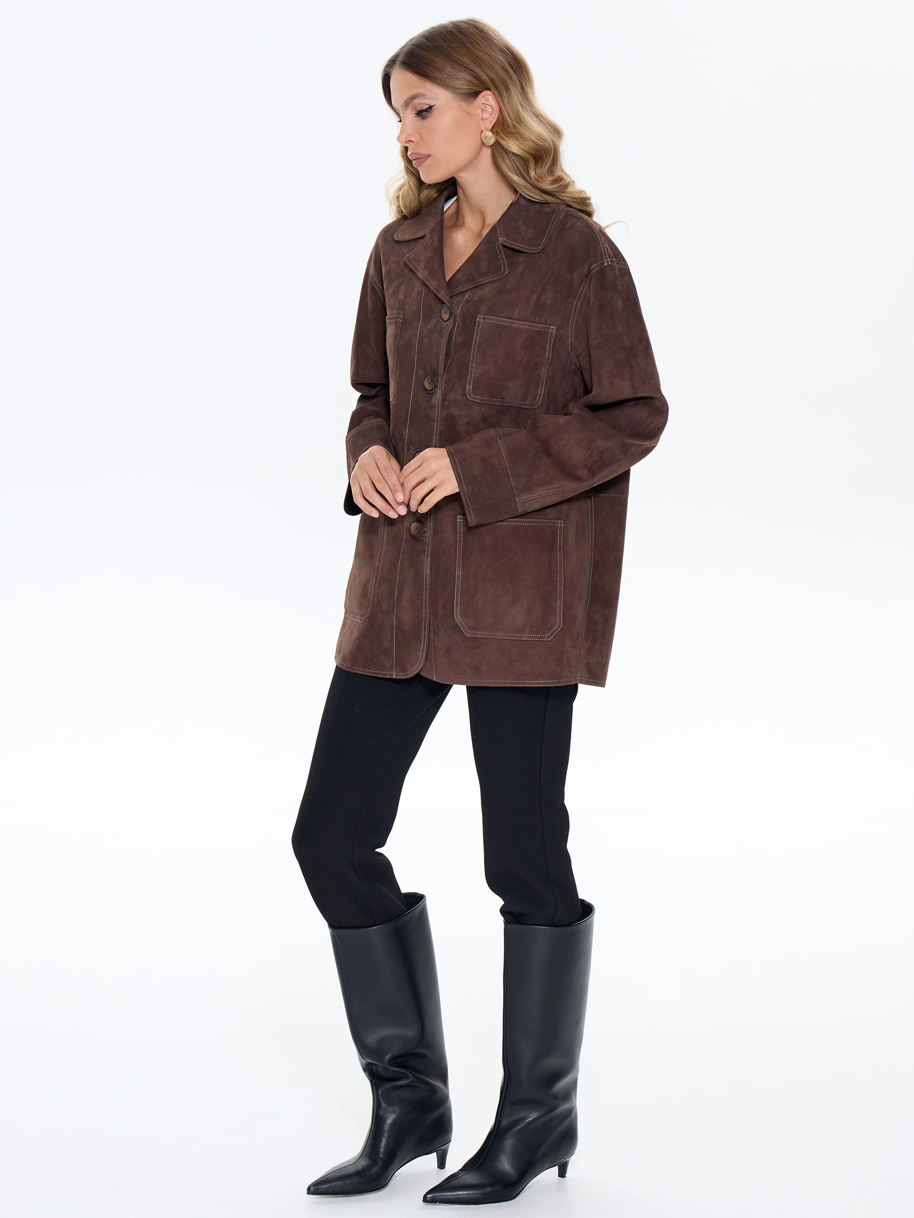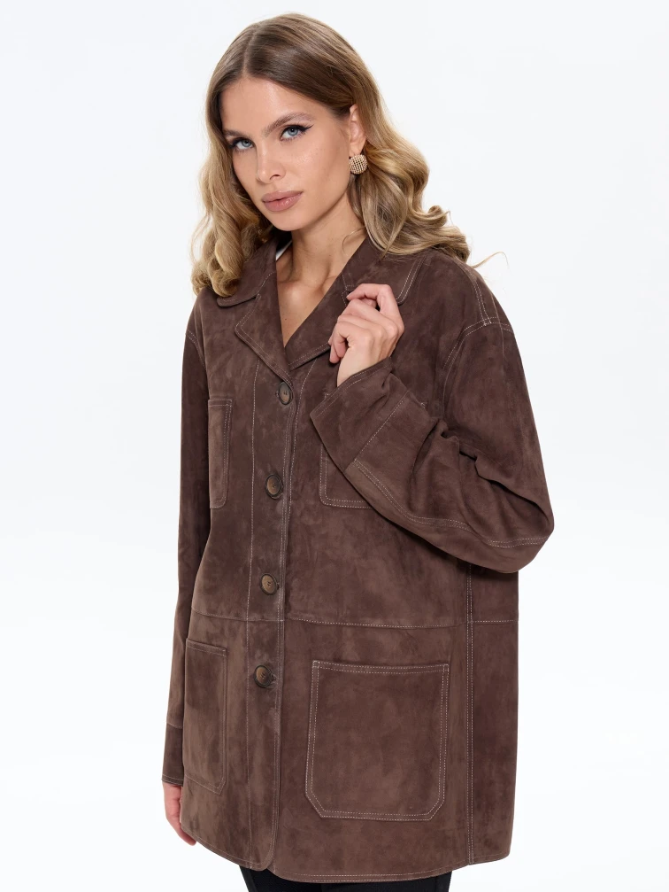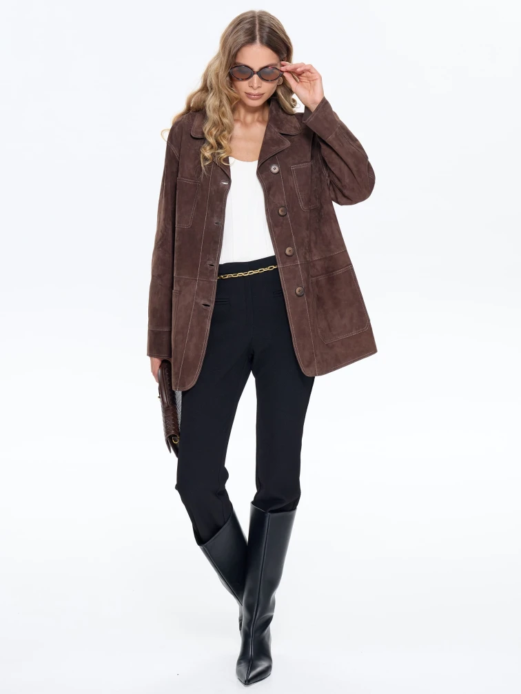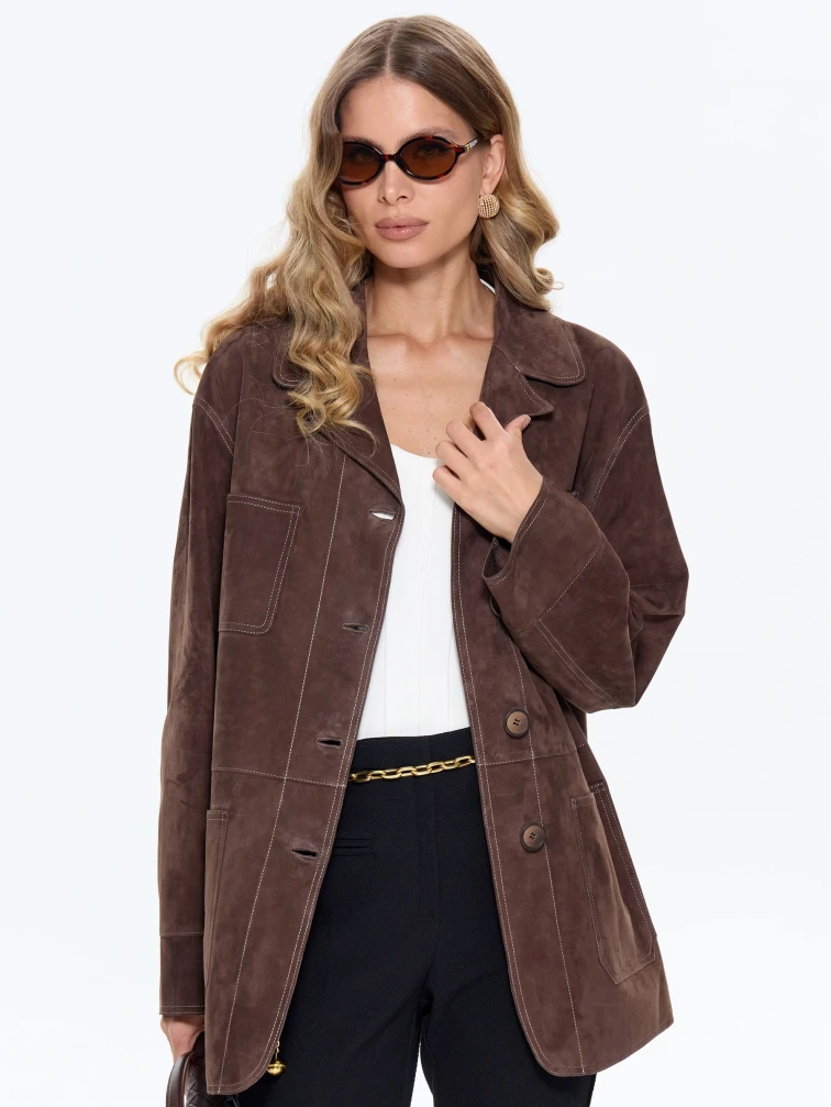 Пиджак с английским воротником выполнен из светло-коричневой замши с контрастной отстрочкой премиум-класса. Прямой силуэт изделия комфортно сидит по фигуре, не сковывая движений. Застёжка на пуговицы. Модель дополнена четырьмя накладными карманами.