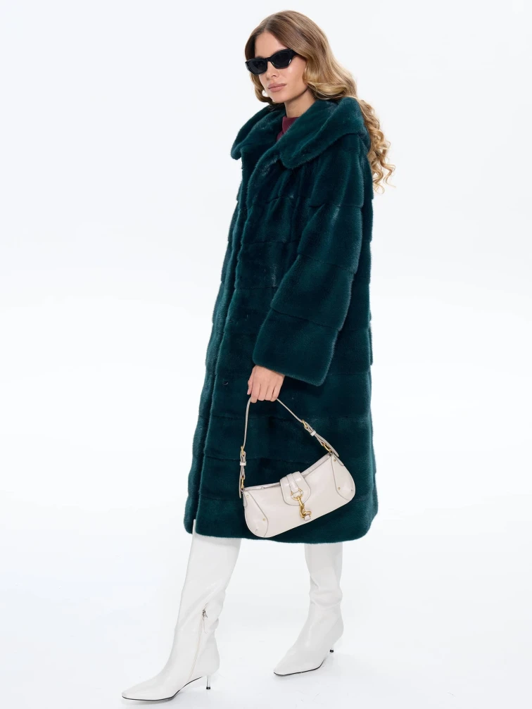Длинная зеленая шуба из низковорсовой густой норки станет отличным решением для холодной зимы. Прямой крой, поперечная раскладка меха. Модель дополнили глубоким капюшоном. Изделие получилось теплым и легким.