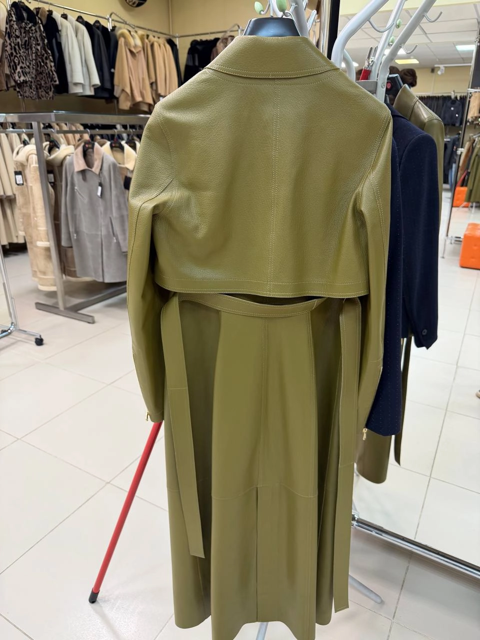 Уникальная модель два в одном длиной 128 см из мягчайшей мелкозернистой кожи премиального качества: съемная отлетная кокетка с рукавами позволяет носить плащ как элегантную длинную жилетку. Прямой силуэт с отложным воротником, удобные врезные карманы и высокая шлица сзади обеспечивают безупречную посадку и свободу движений. Длинный пояс подчеркивает талию, а молнии на рукавах добавляют дерзкий акцент. Застежка на кнопки гарантирует надежную фиксацию. Отсутствие подкладки демонстрирует тончайшую выработку кожи — истинный признак премиум-класса. Совет стилиста: носите с кожаными брюками и ботфортами для дерзкого образа или с платьем-миди и ботильонами для романтичного выхода — этот трансформируемый плащ станет вашей инвестицией в стиль и подарит безграничный простор для экспериментов.