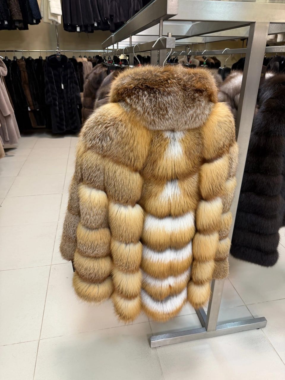 Элегантная шуба из роскошного меха лисы рыжего оттенка выполнена в свободном крое длиной 80 см с классическим английским воротником и рукавами кимано. Модель без капюшона с врезными карманами идеально сочетает в себе уют и стиль. Стилисты рекомендуют носить эту эффектную шубу с узкими джинсами и ковбойскими сапогами для повседневного образа или с однотонным платьем-миди и замшевыми ботильонами для вечернего выхода — ее яркий цвет и современный силуэт создадут запоминающийся образ.