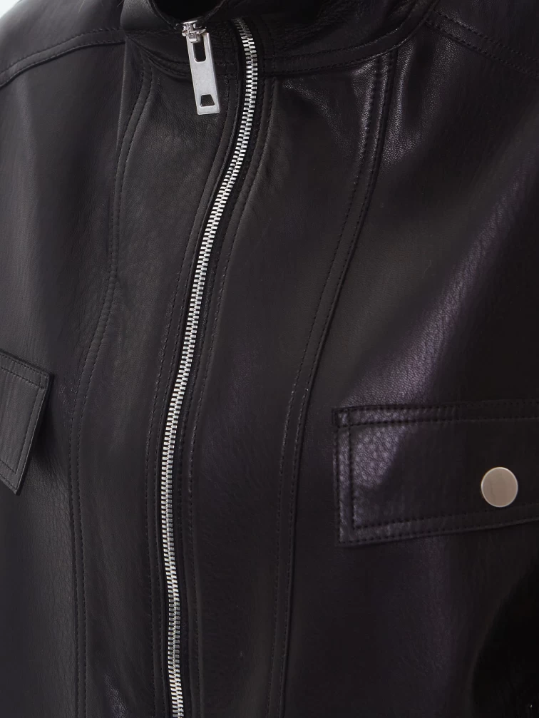 Куртку прямого кроя со спущенной линией плеча выполнили из мелкозернистой кожи премиум класса. На поясе изделия предусмотрены регулируемые боковые паты. Модель без подклада с врезными карманами застегивается крупной молнией.