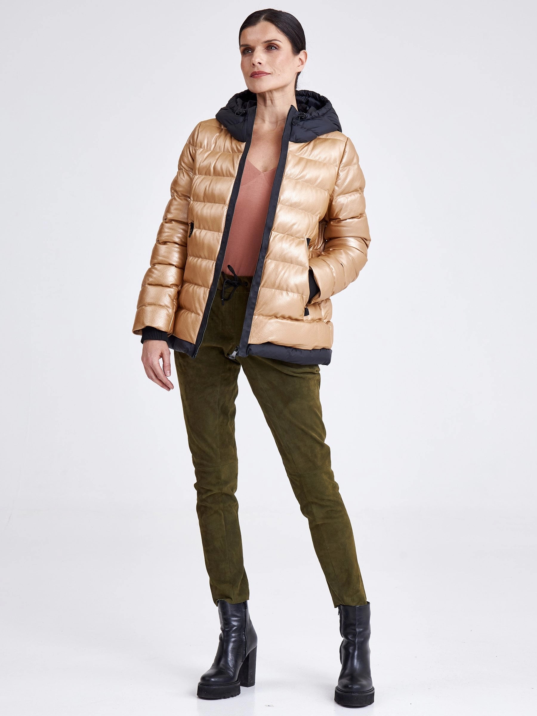 Утепленная короткая кожаная куртка в теплом бежевом цвете из натуральной коже в тандеме с черной водоотталкивающей тканью. Глубокий капюшон, позволяет обойтись без головного убора в ненастную погоду. Утеплитель - немецкий синтепон Френденберг. Отличная теплоизоляция, превосходная парапроницаемость, простой уход.