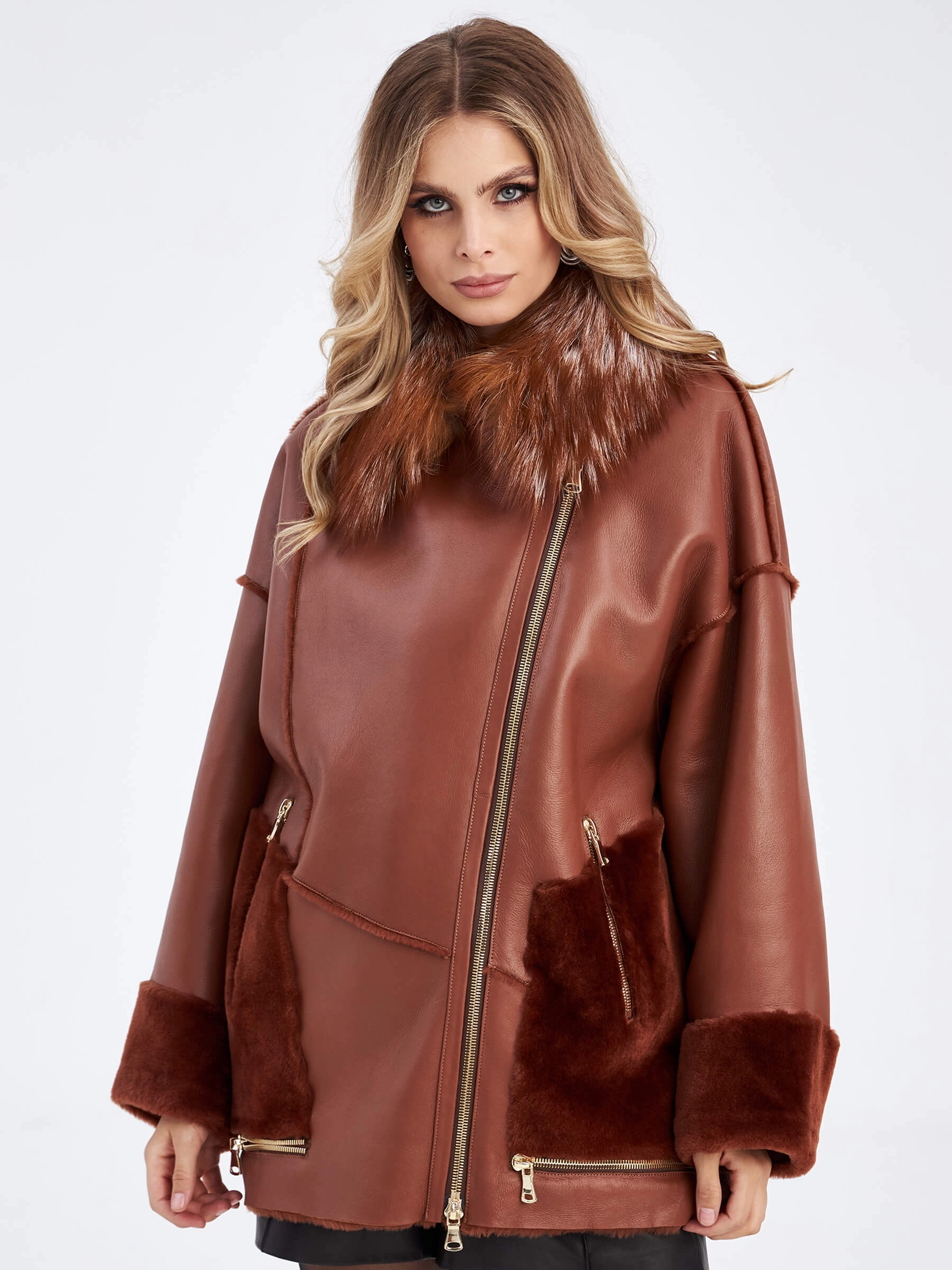 Женская куртка оверсайз из натуральной овчины с воротником из меха лисицы премиум класса 2042, виски, размер 42, артикул 63510