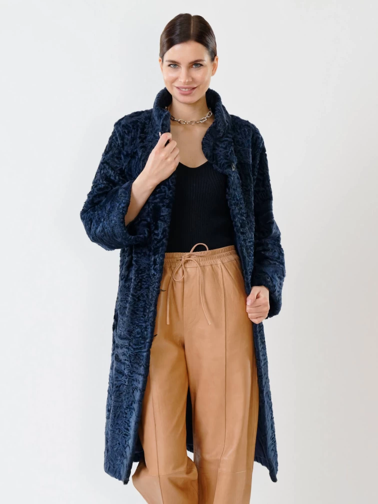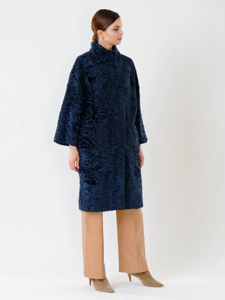Товар каракулевая женская шуба 17106(с), синяя, размер 48, артикул 22630 выполнен из каракуль с застежкой клипсы. Рассчитан на сезон: осень-зима. Длина изделия свыше 90 см, силуэт прямой.