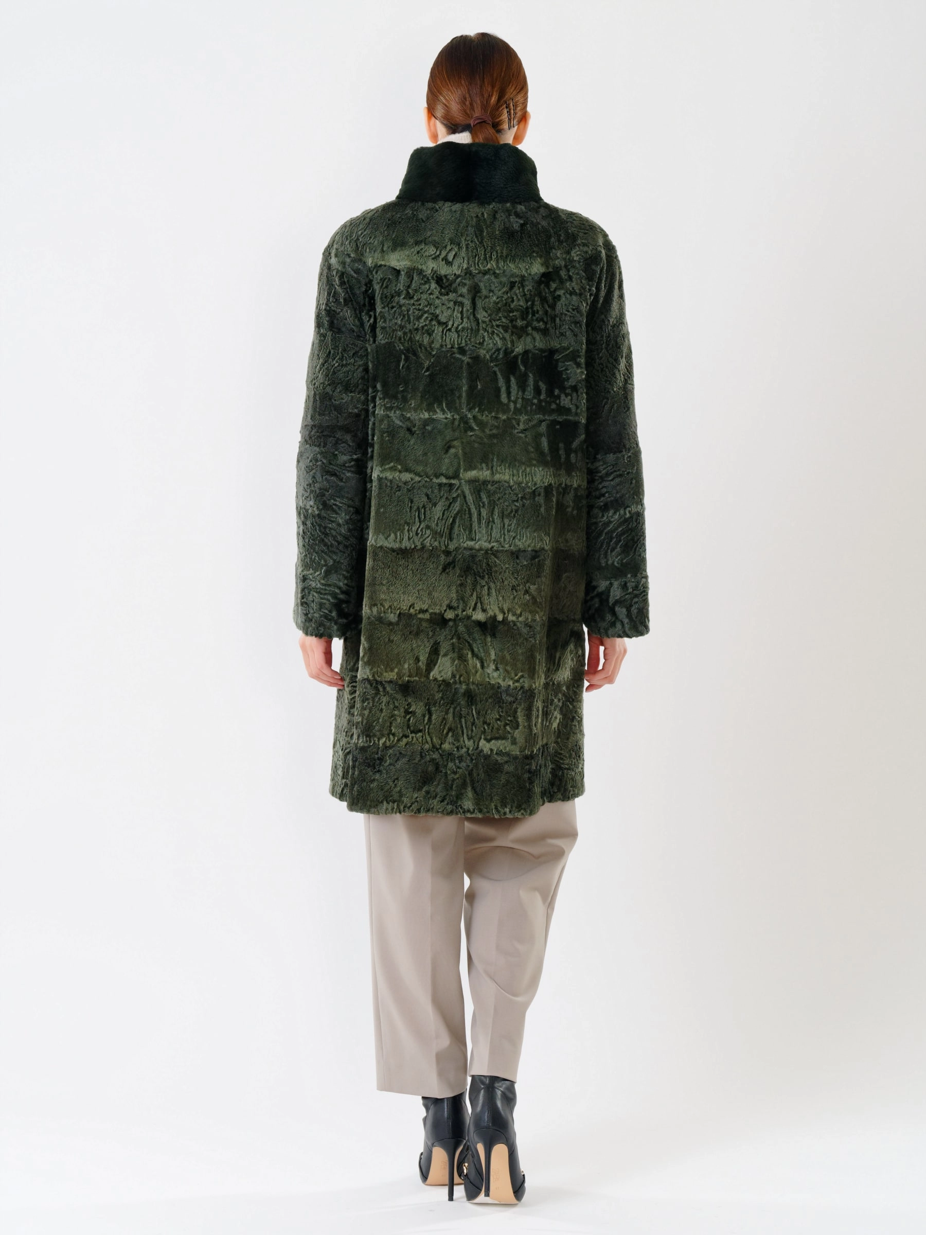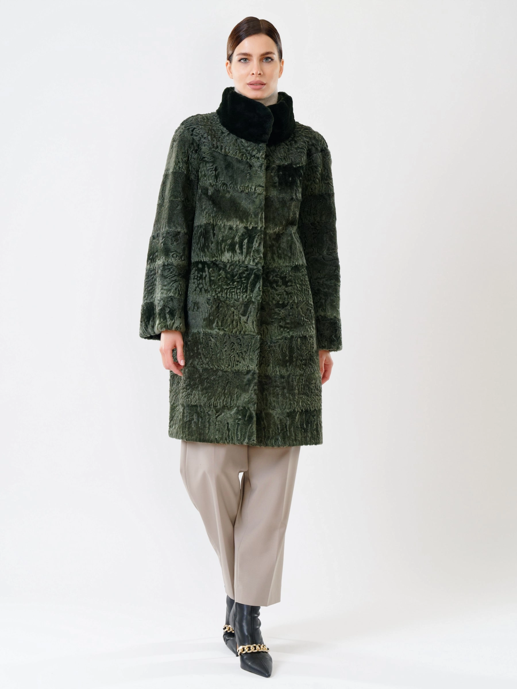 Товар женская шуба из меха каракуля с мехом бобра 325, зеленая, размер 48, артикул 22480 выполнен из каракуль с застежкой клипсы. Рассчитан на сезон: осень-зима. Длина изделия свыше 90 см, силуэт прямой.