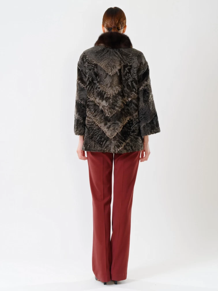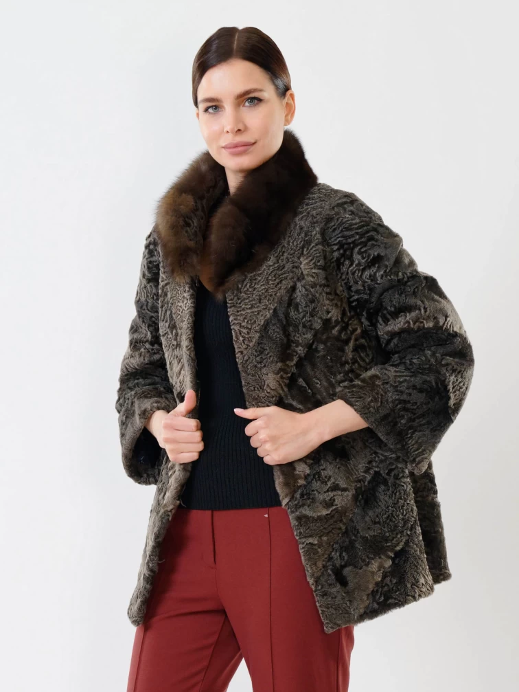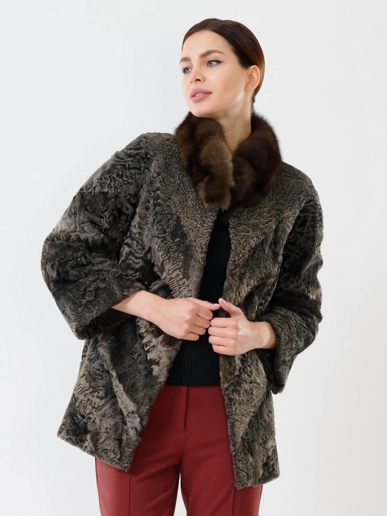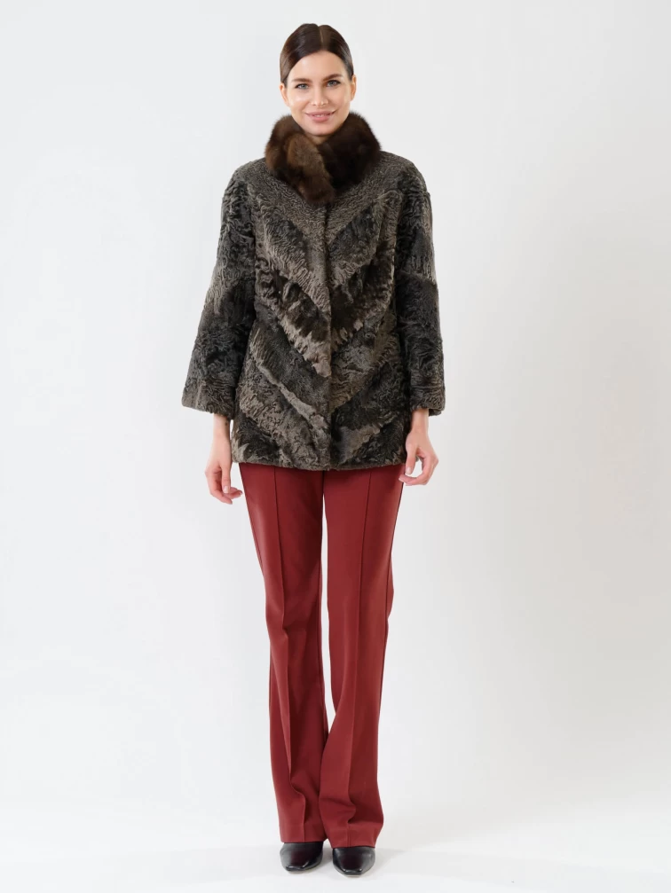 Эффектная куртка из каракуля. Воротник-стойка из меха соболя. Великолепное качество меха. Ювелирный подбор шкурок по оттенку и структуре волоса. Аккуратная работа портных. Чёткая посадка по фигуре. Выдержано. Стильно.