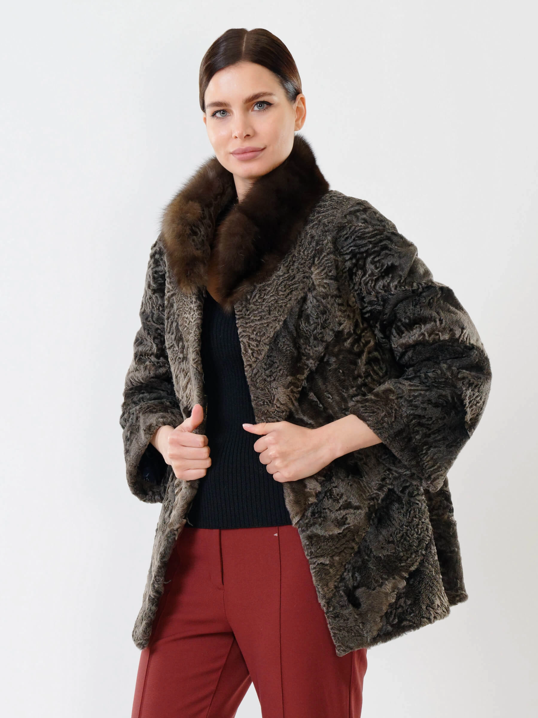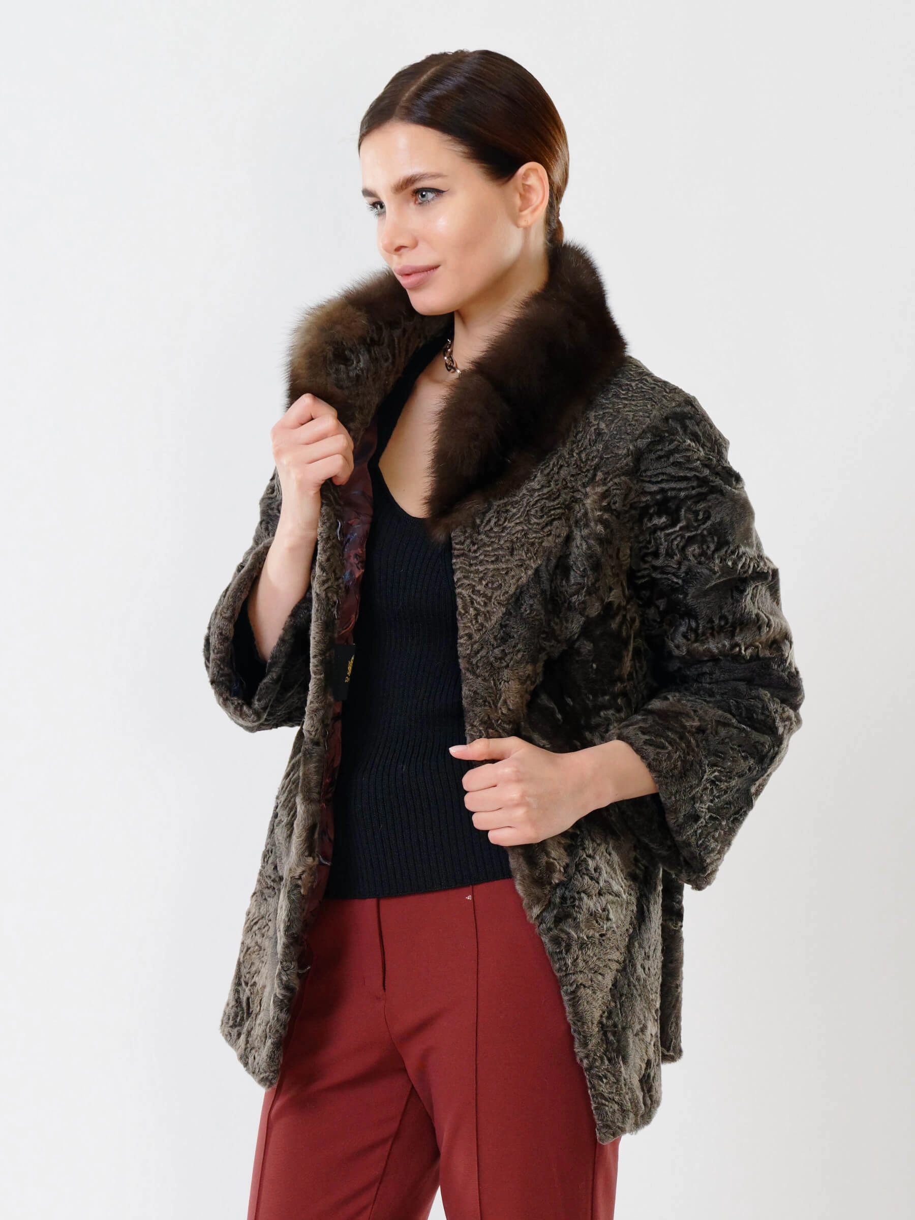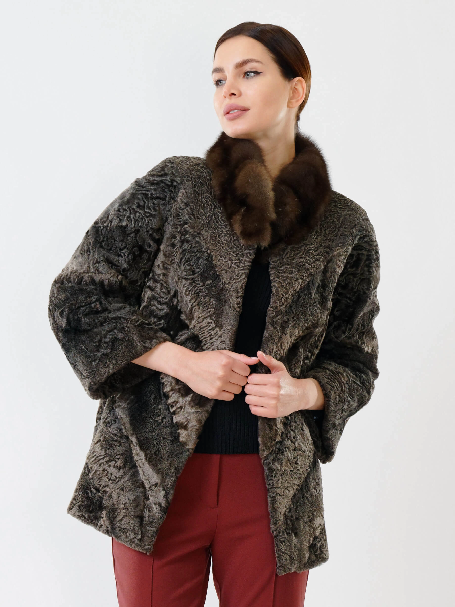 Короткая женская шуба из меха каракуля с норковым воротником 341, коричневая, размер 46, артикул 22550