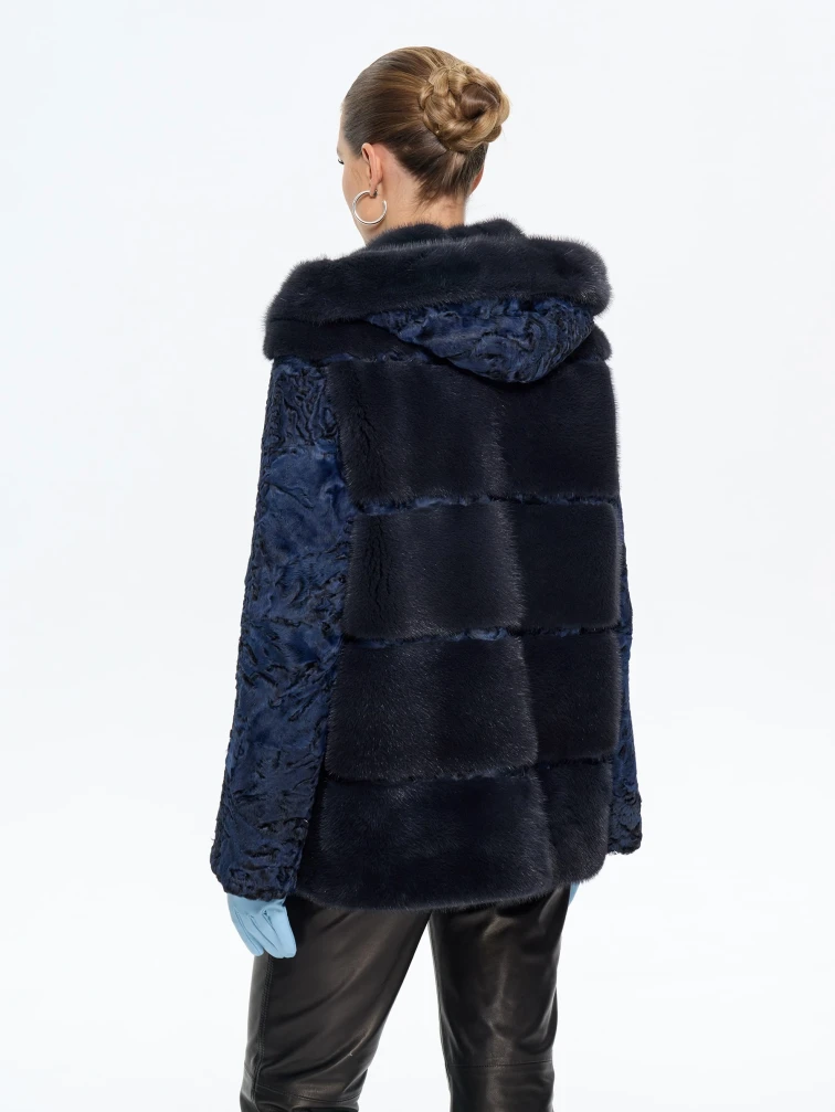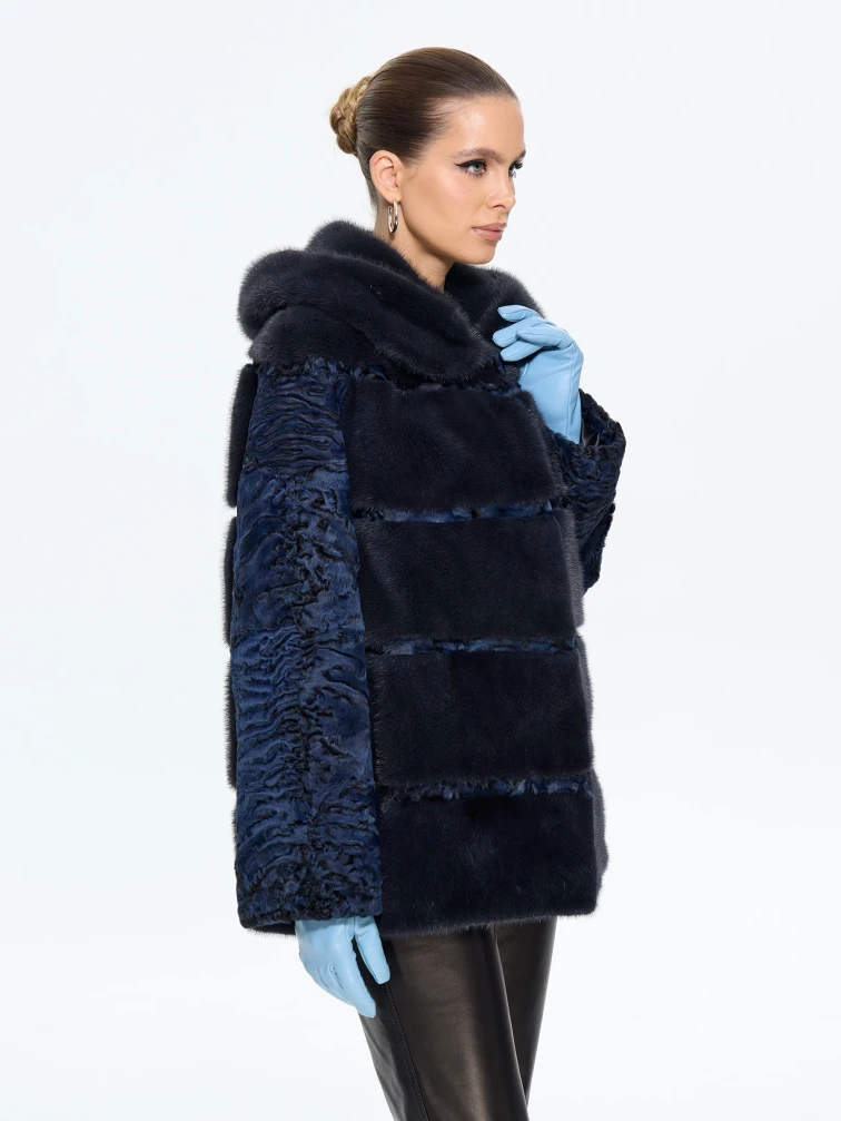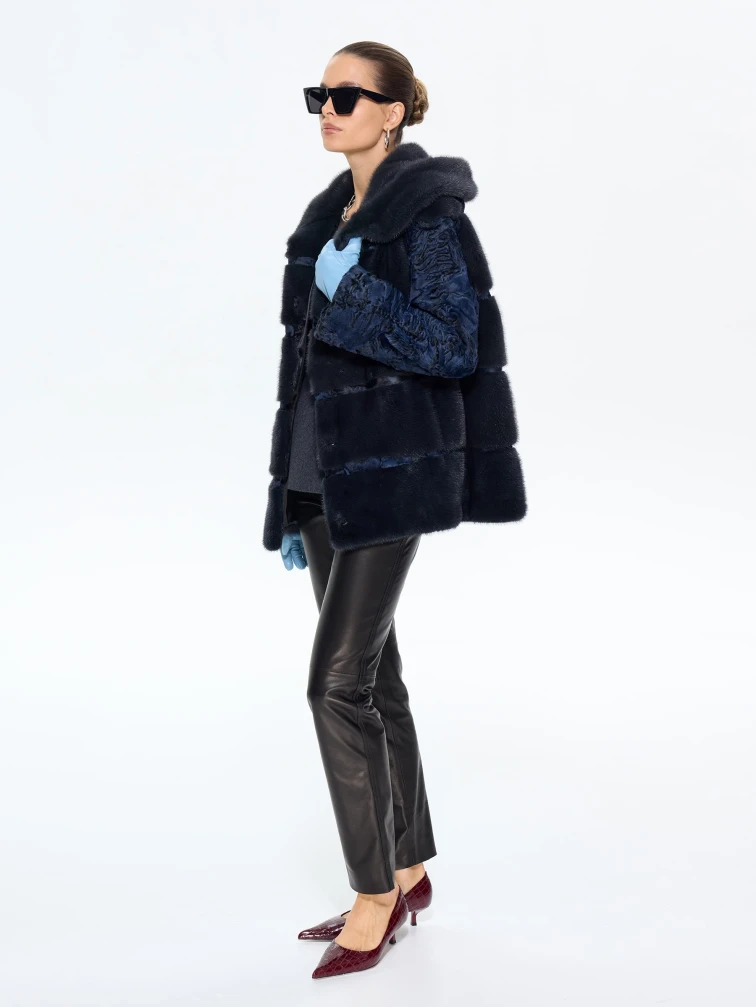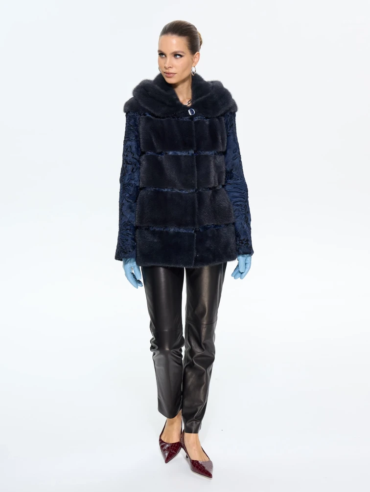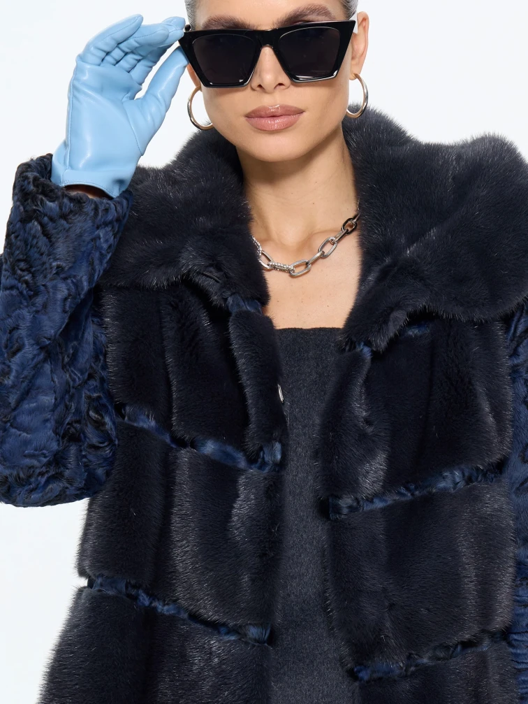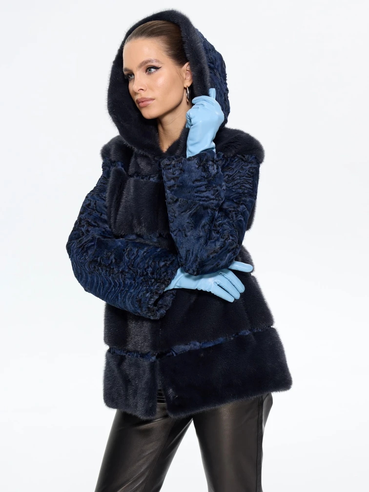 Товар женская шуба из меха норки софия, синяя, размер 50, артикул 65580 выполнен из мех каракульчи с застежкой клипсы. Рассчитан на сезон: весна-осень. Длина изделия 70 см, силуэт прямой.