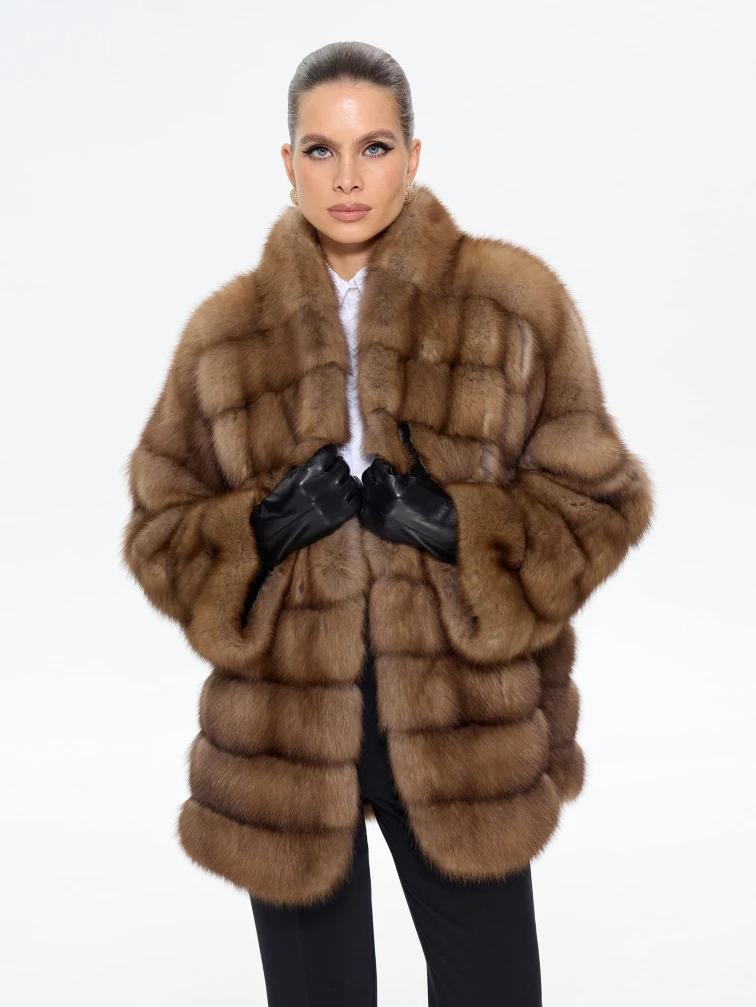 Элегантная шуба из меха куницы премиум-класса длиной 70 см с эффектным V-образным воротником и спущенным рукавом подчеркнет ваш изысканный вкус. Прямой силуэт в светло-коричневом оттенке и скрытые клипсы создают лаконичную элегантность. Стилисты рекомендуют носить эту модель с водолазкой и кожаными брюками для повседневного образа или с платьем-чехлом и сапогами-ботфортами для безупречного вечернего выхода, даря ощущение роскоши и комфорта.