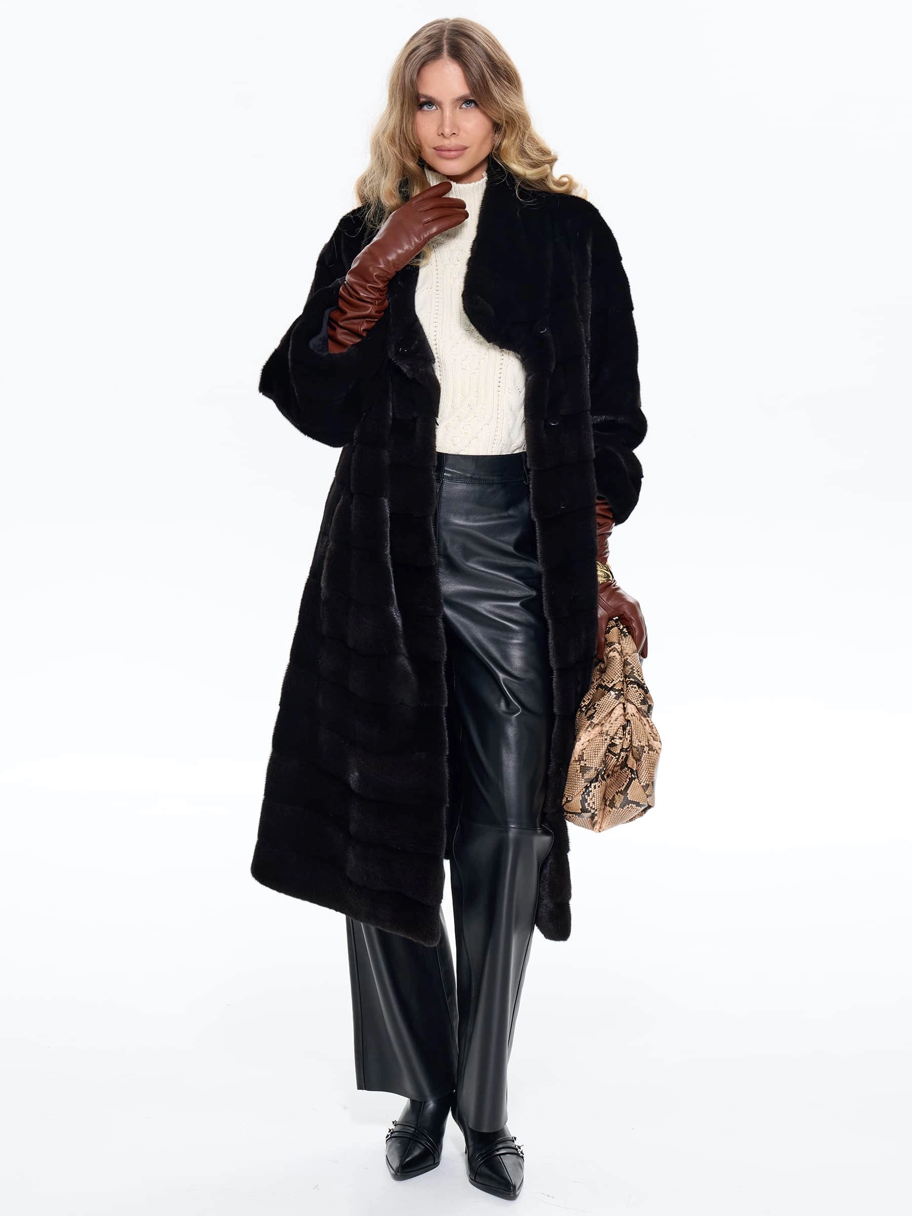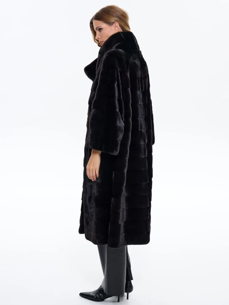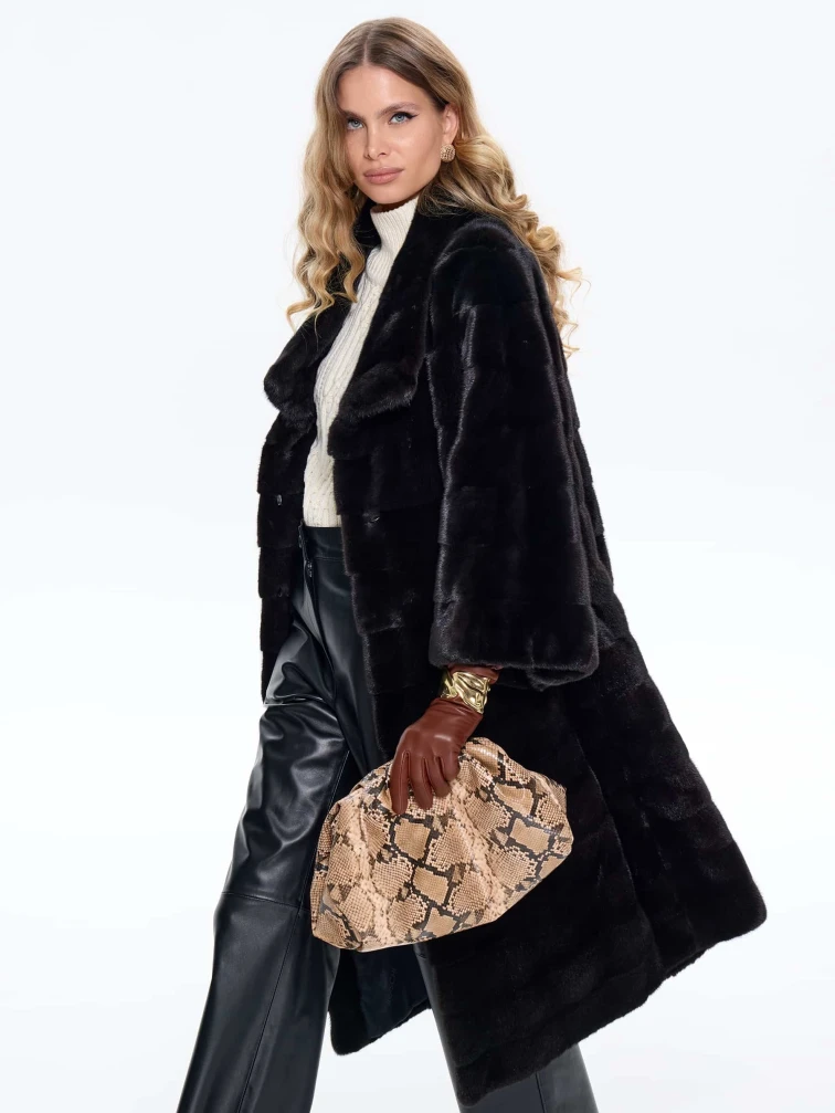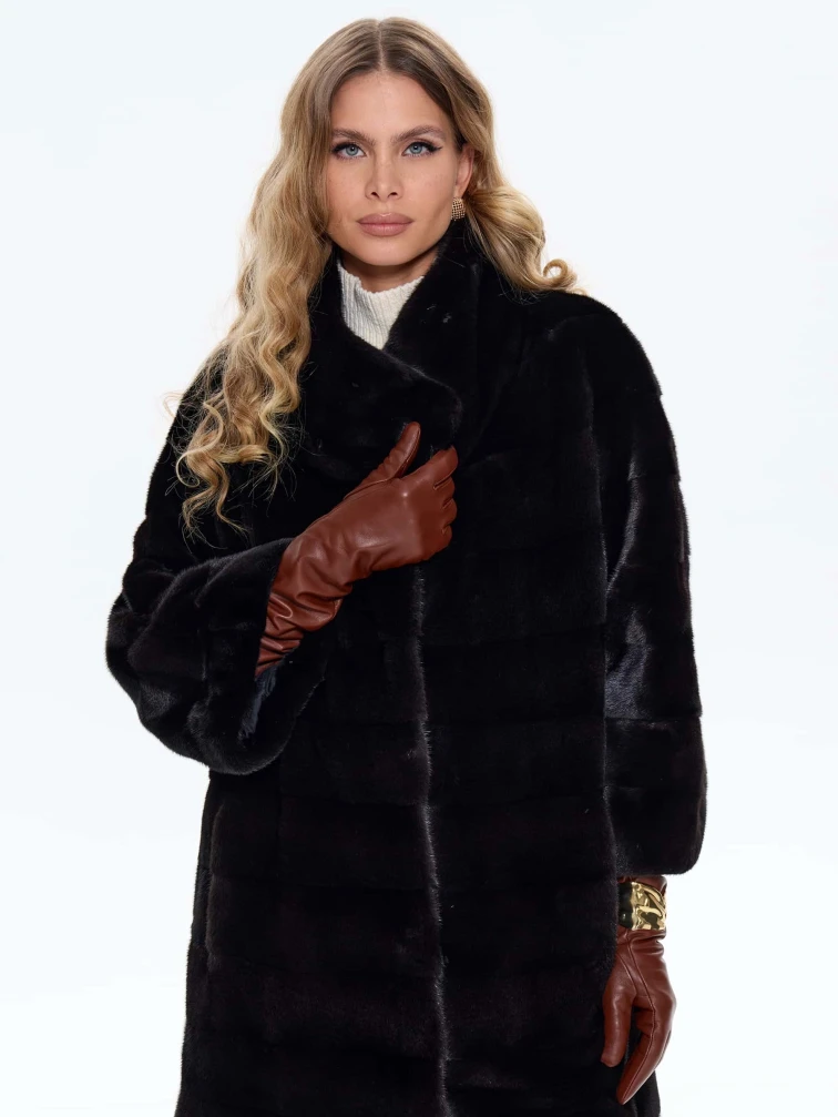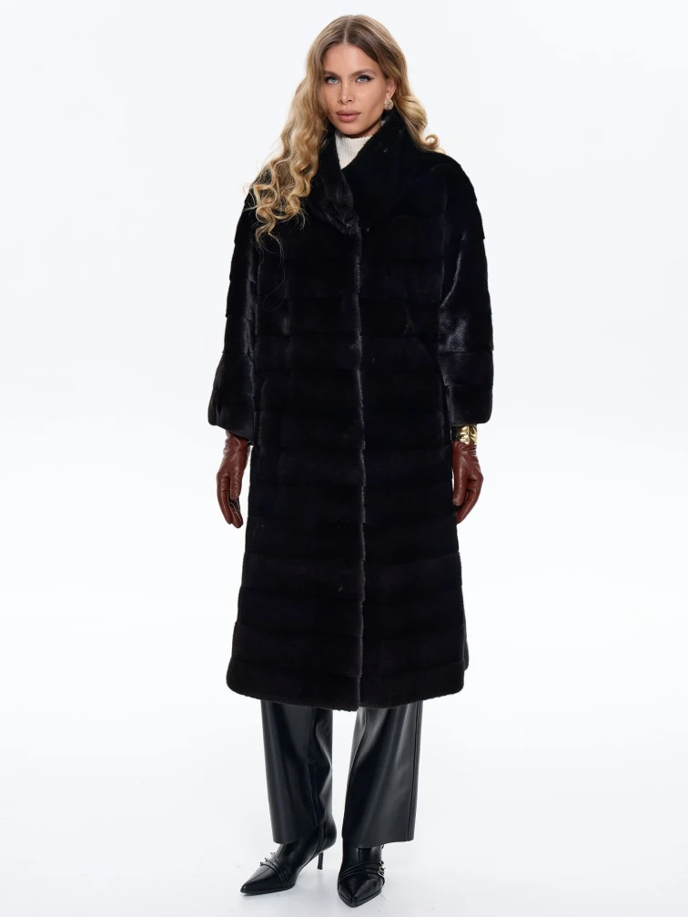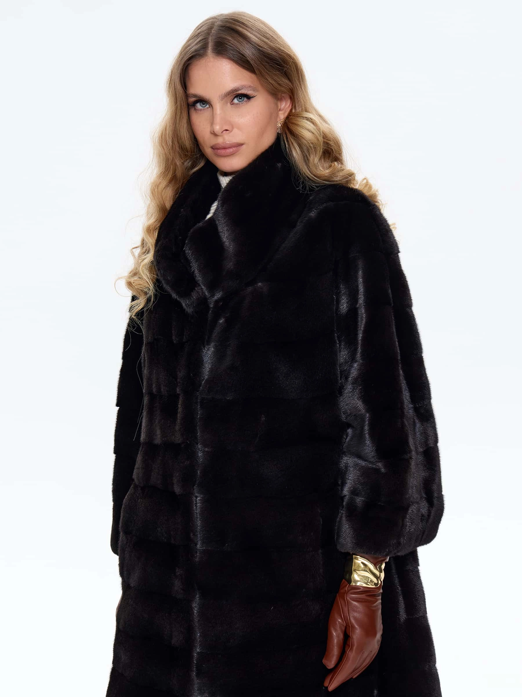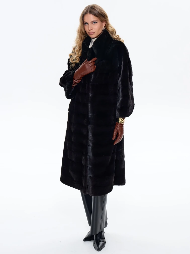 Эта шуба представляет собой современную интерпретацию классики: удлиненный прямой силуэт выполнен в поперечной раскладке из меха натуральной норки премиум-класса. Особенностью модели стал рукав реглан премиум-исполнения с бесшовным соединением плеча и рукава, что полностью устраняет давление на верхнюю часть тела и обеспечивает абсолютную свободу движений. Специально разработанный крой проймы гарантирует комфорт даже при ношении объемной одежды. Длина до колен предлагает максимальную защиту от ветра и мороза, сохраняя при этом элегантность и мобильность. Высокий воротник-стойка мягко облегает шею без малейшего дискомфорта и гармонично сочетается с любыми аксессуарами. Модель отличается идеальной посадкой по фигуре, дополненной удобными боковыми карманами, а скрытые клипсы завершают безупречный образ этой роскошной шубы.