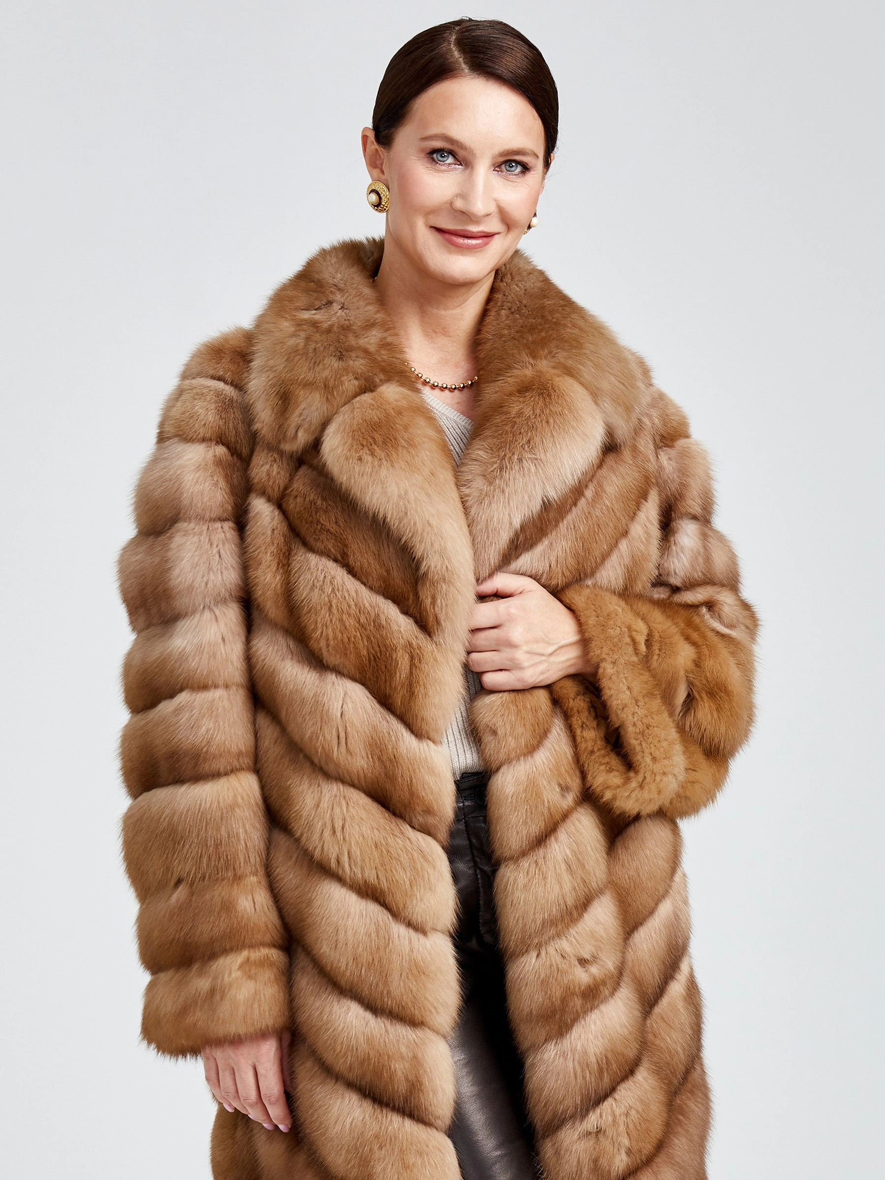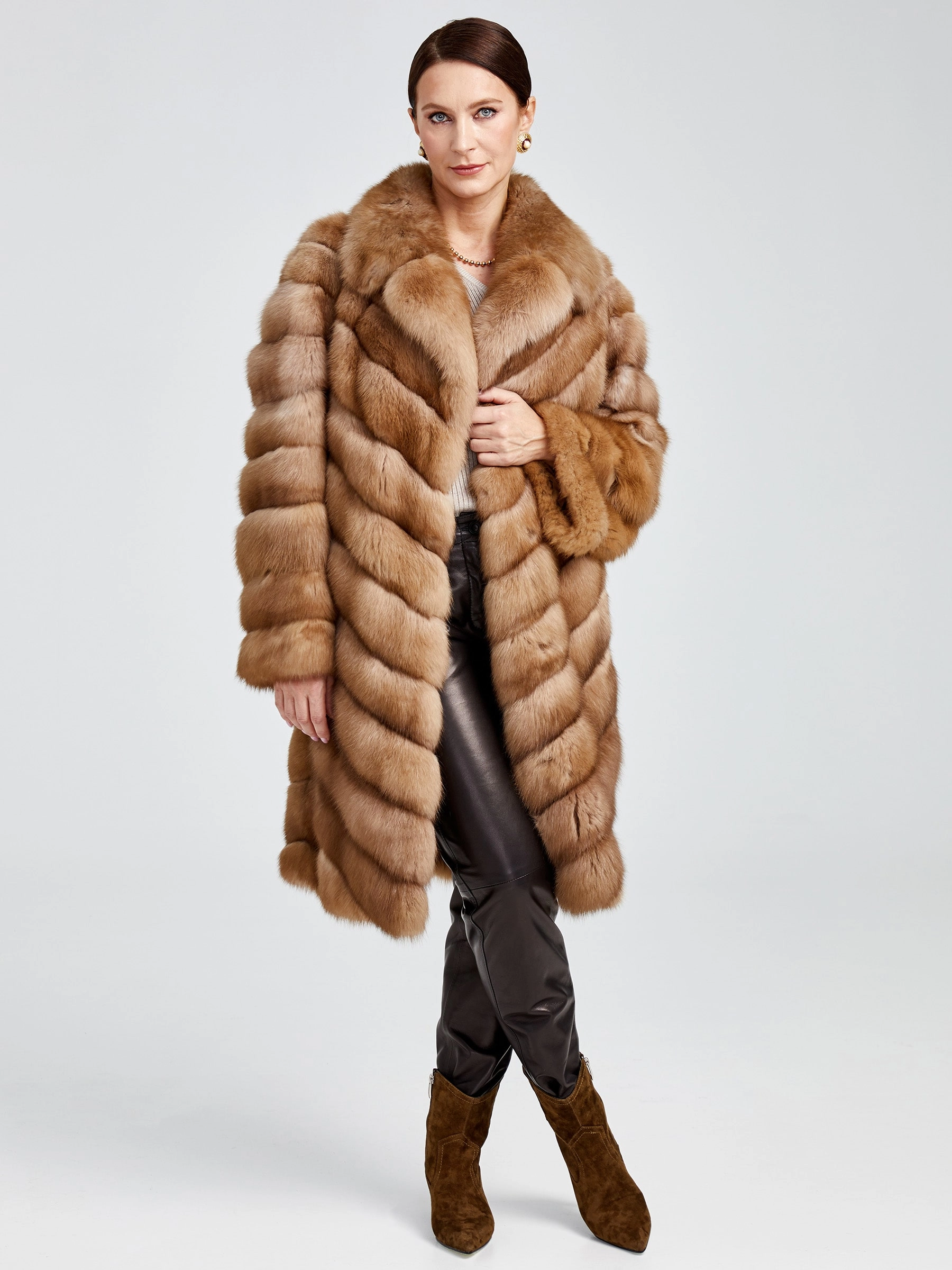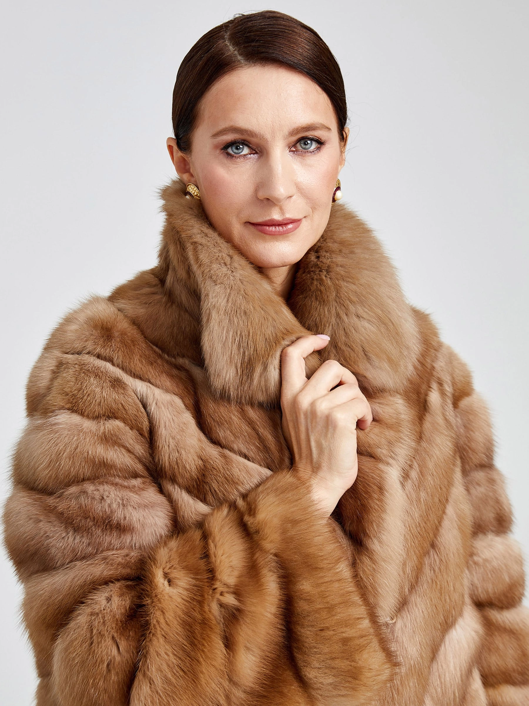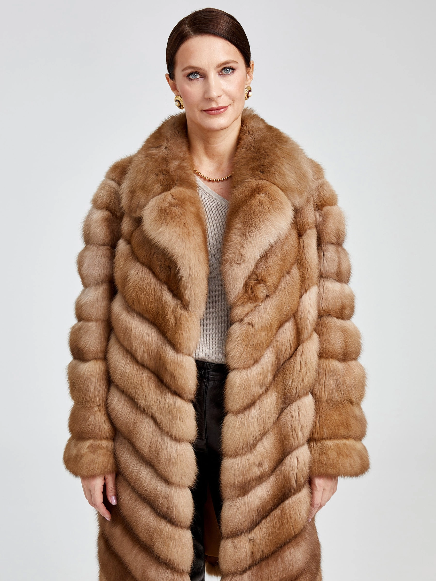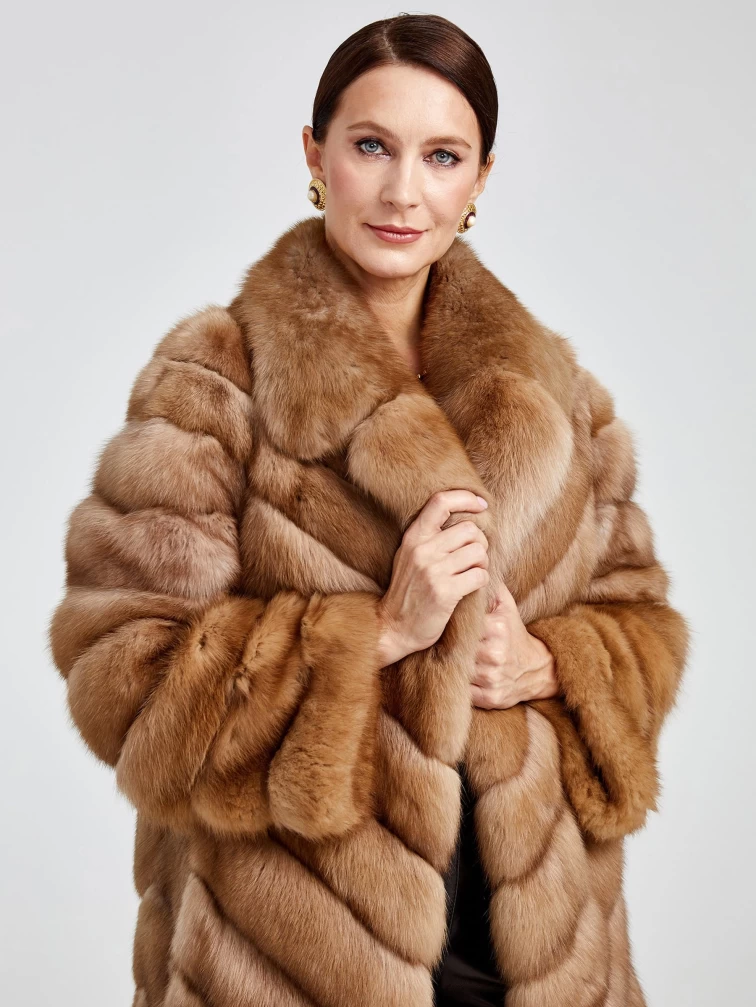 Пальто из меха соболя. Английский воротник. Полноценная длина рукава. Диагональная раскладка меха. Благодаря уникальным характеристикам соболиного меха шубки из такого материала не теряют свою популярность. Они отличаются удивительной легкостью. Безупречный подбор меха. Премиальное качество.