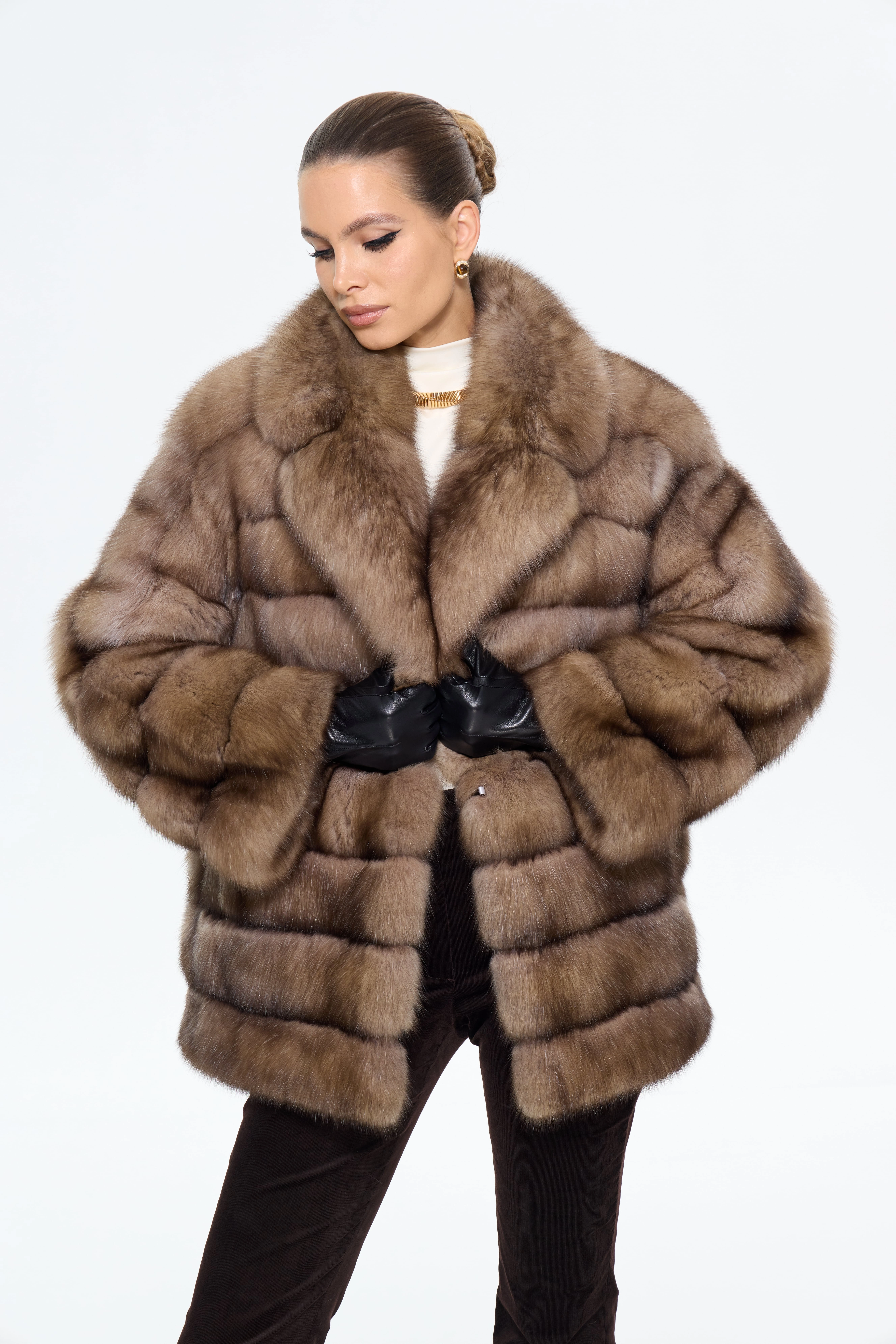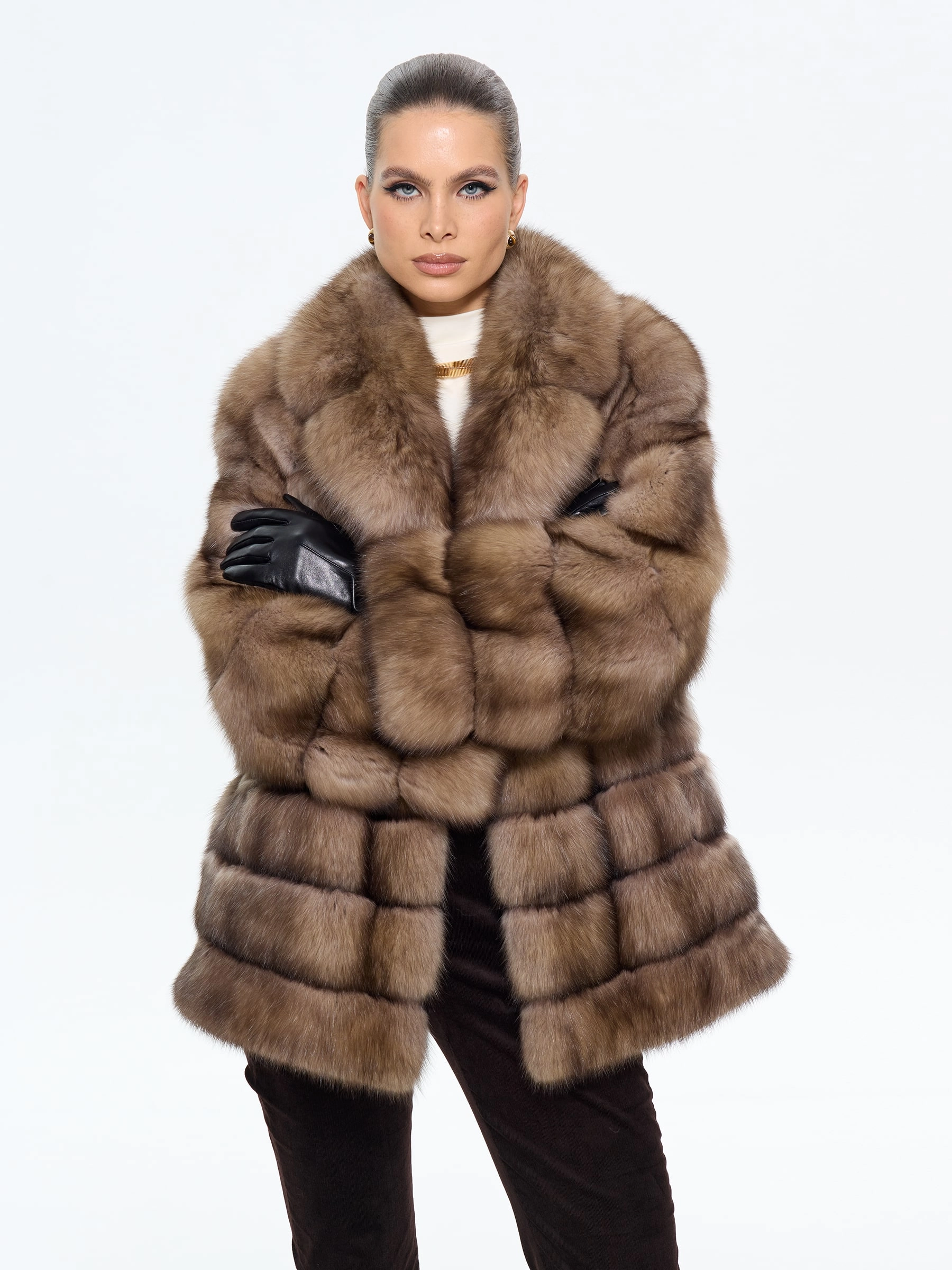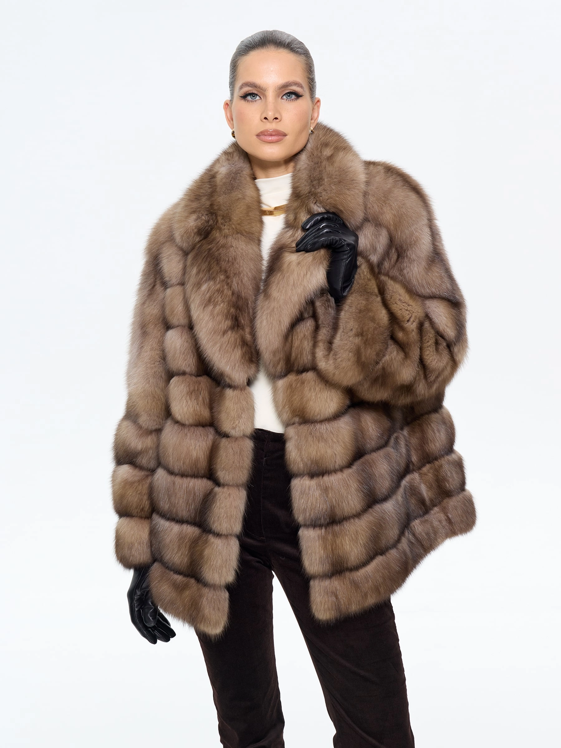 Женская шуба из меха соболя с английским воротником — это эталон роскоши и безупречного вкуса. Модель прямого силуэта длиной 70 см из натурального соболя цвета натуральный подчеркивает элегантность и статус. Выразительный английский воротник и спущенная линия плеча добавляют образу благородной легкости. Стилисты рекомендуют носить эту шубу с вечерними платьями, классическими костюмами или утонченными knit-комплектами, чтобы создать целостный образ для особых случаев. Естественная игра оттенков меха делает каждую модель уникальной.