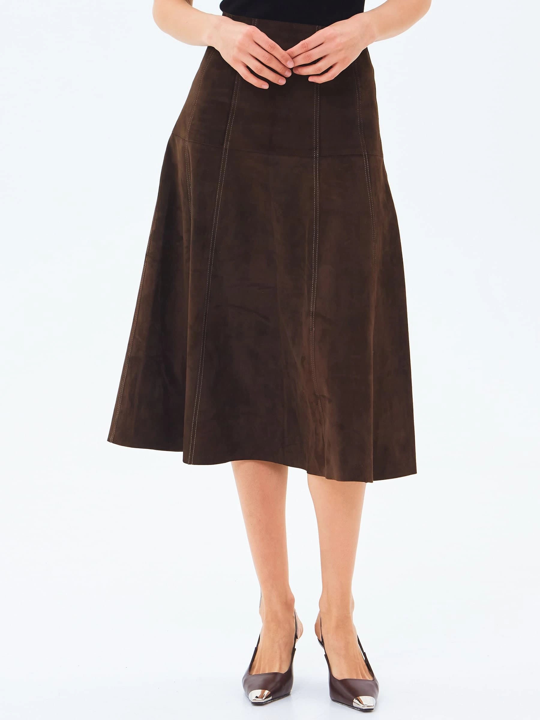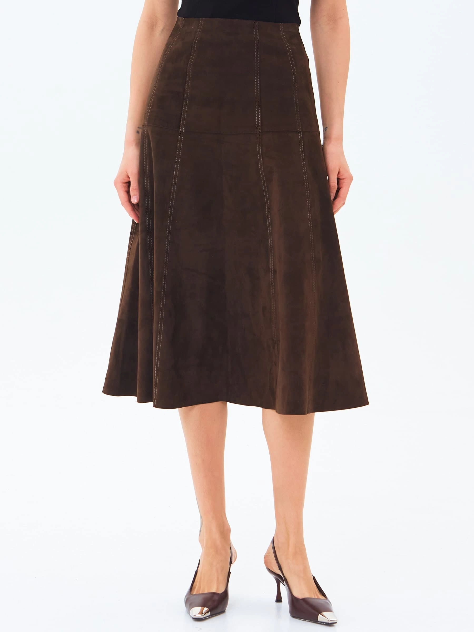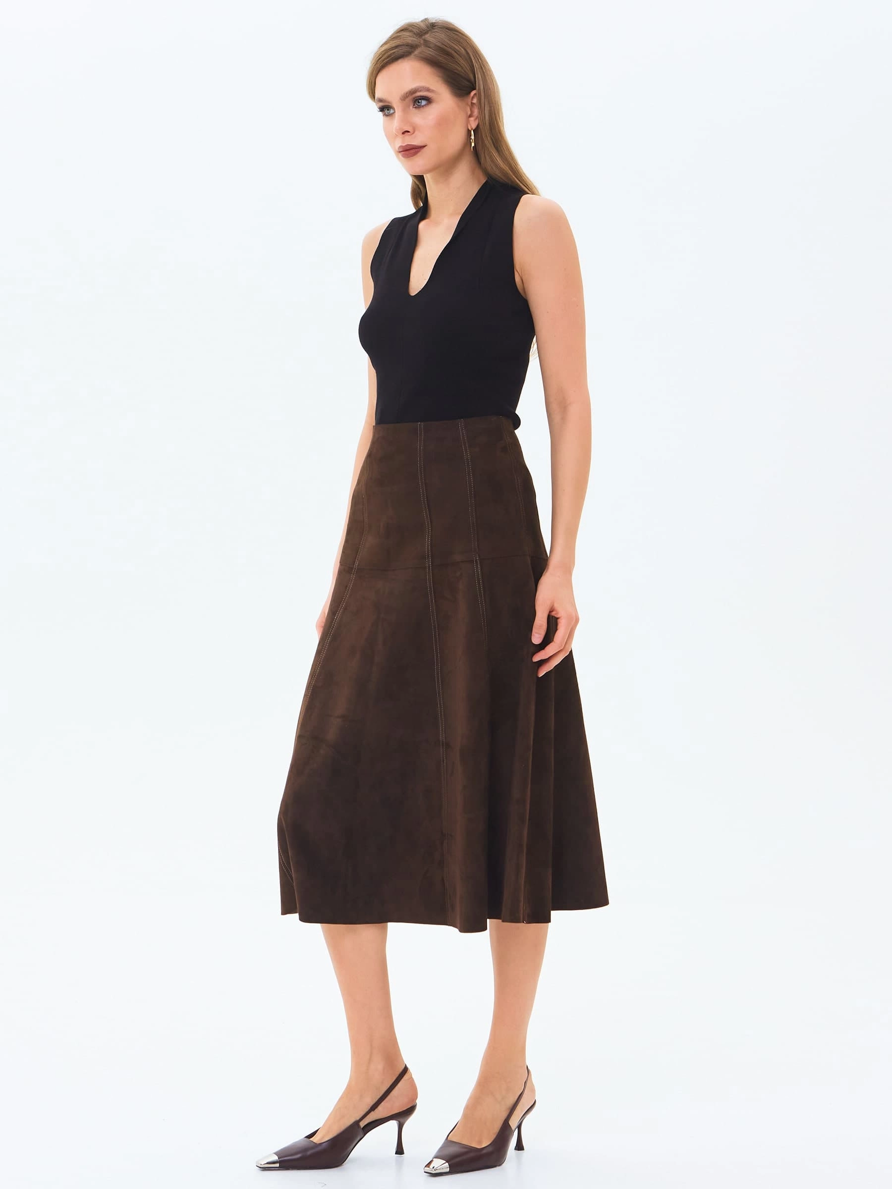 Юбка-миди из мягкой натуральной замши в насыщенном коричневом цвете сочетает полуприлегающий крой с элегантным клешем. Потайная застежка добавляют модели изысканности, а универсальный оттенок делает ее идеальной для создания разных образов — от повседневных с объемными свитерами до вечерних с шелковыми блузами. Качественная замша гарантирует комфорт и долговечность.