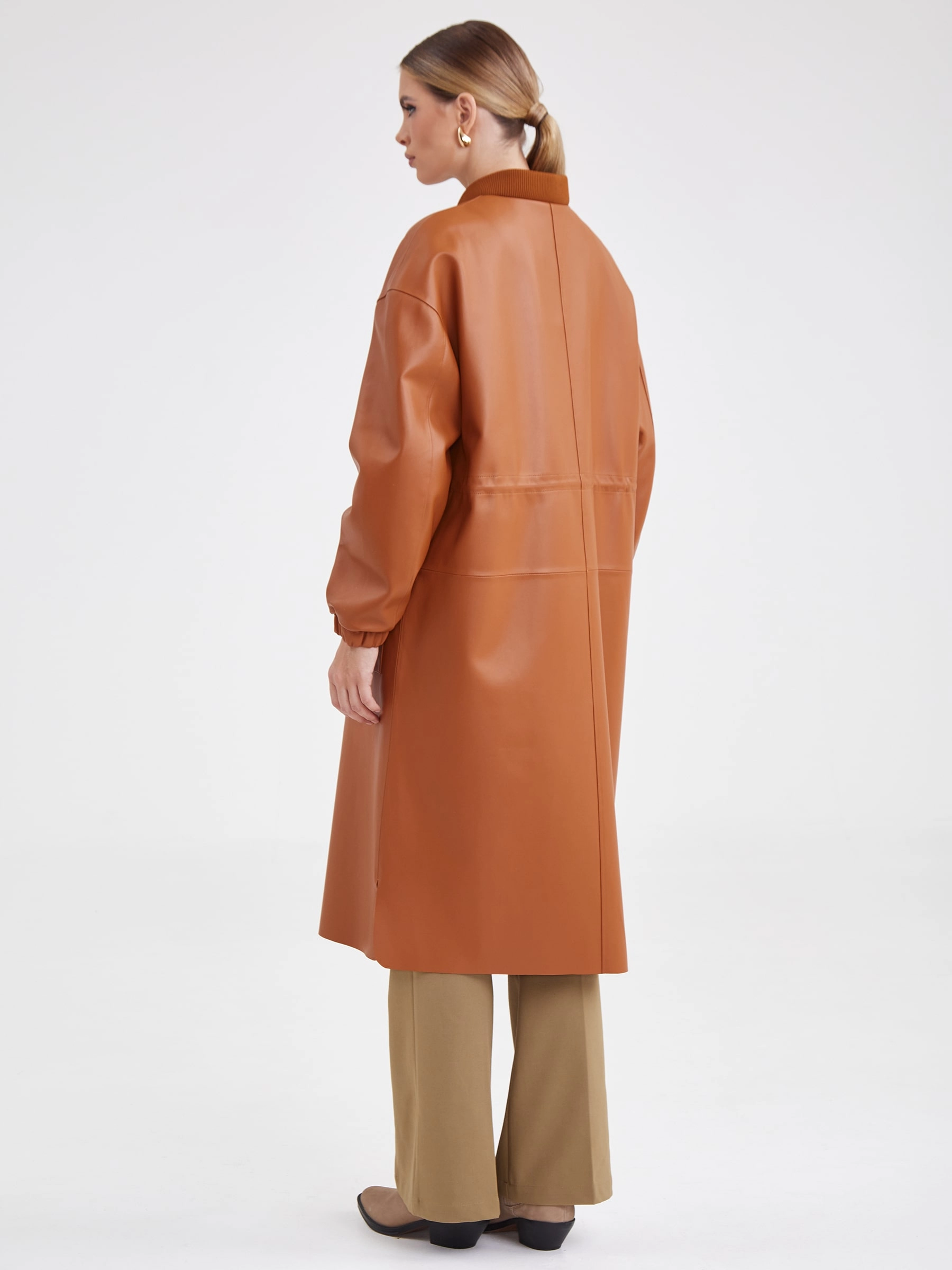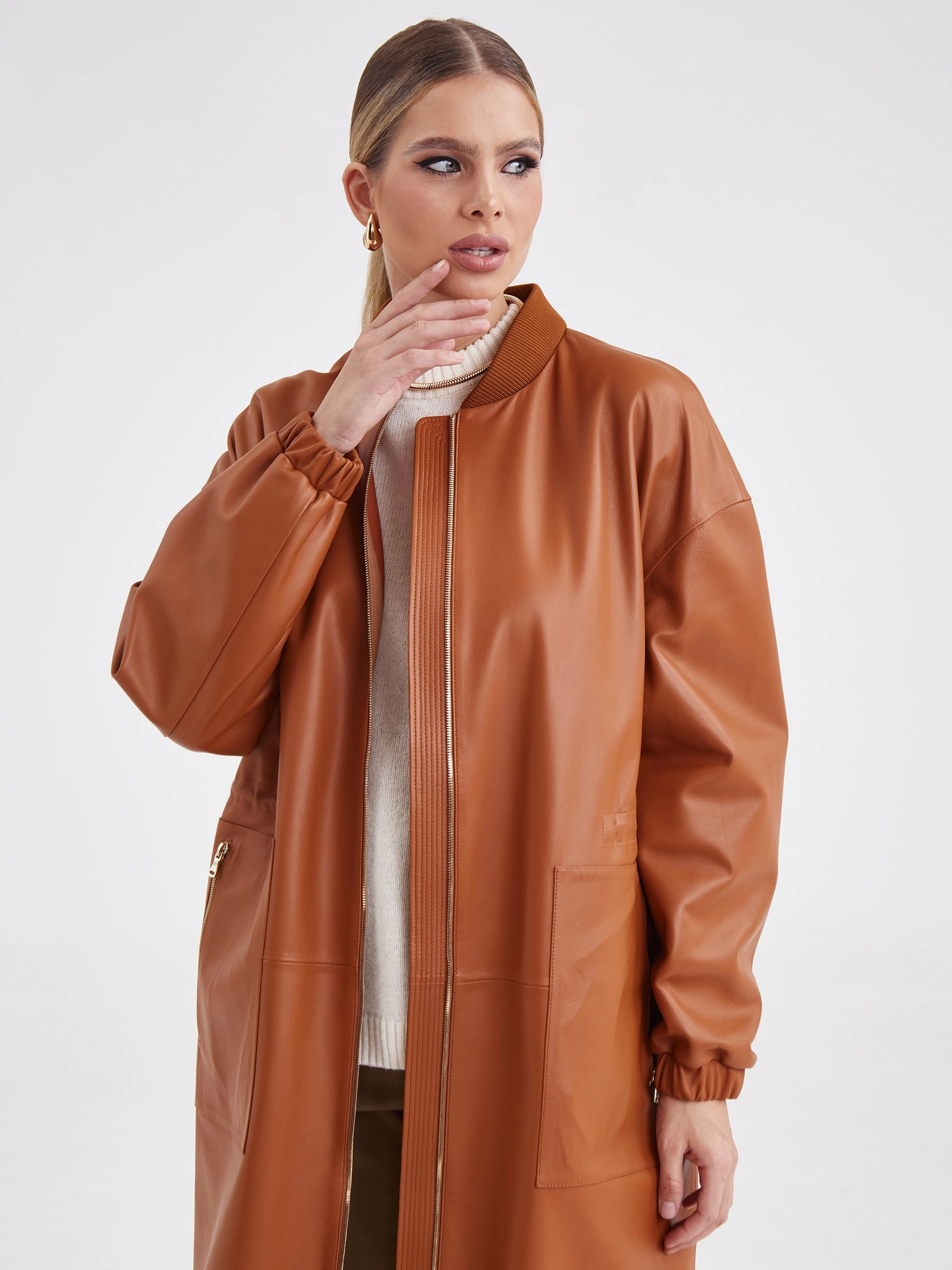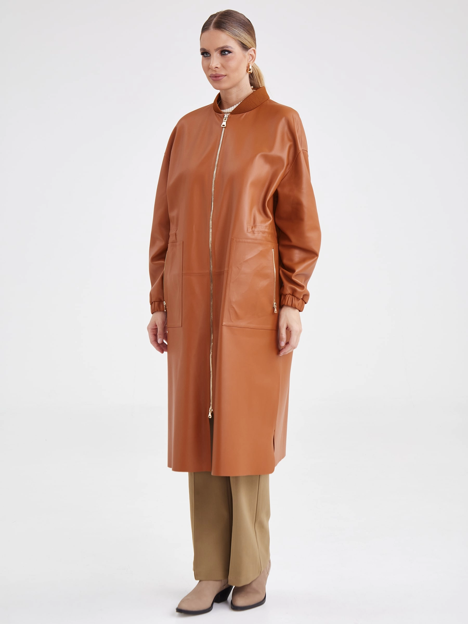Товар женский кожаный плащ бомбер премиум класса 3035, виски, размер 44, артикул 91931 выполнен из натуральной кожи с застежкой молния. Рассчитан на сезон: весна-лето. Длина изделия 110 см, силуэт прямой.