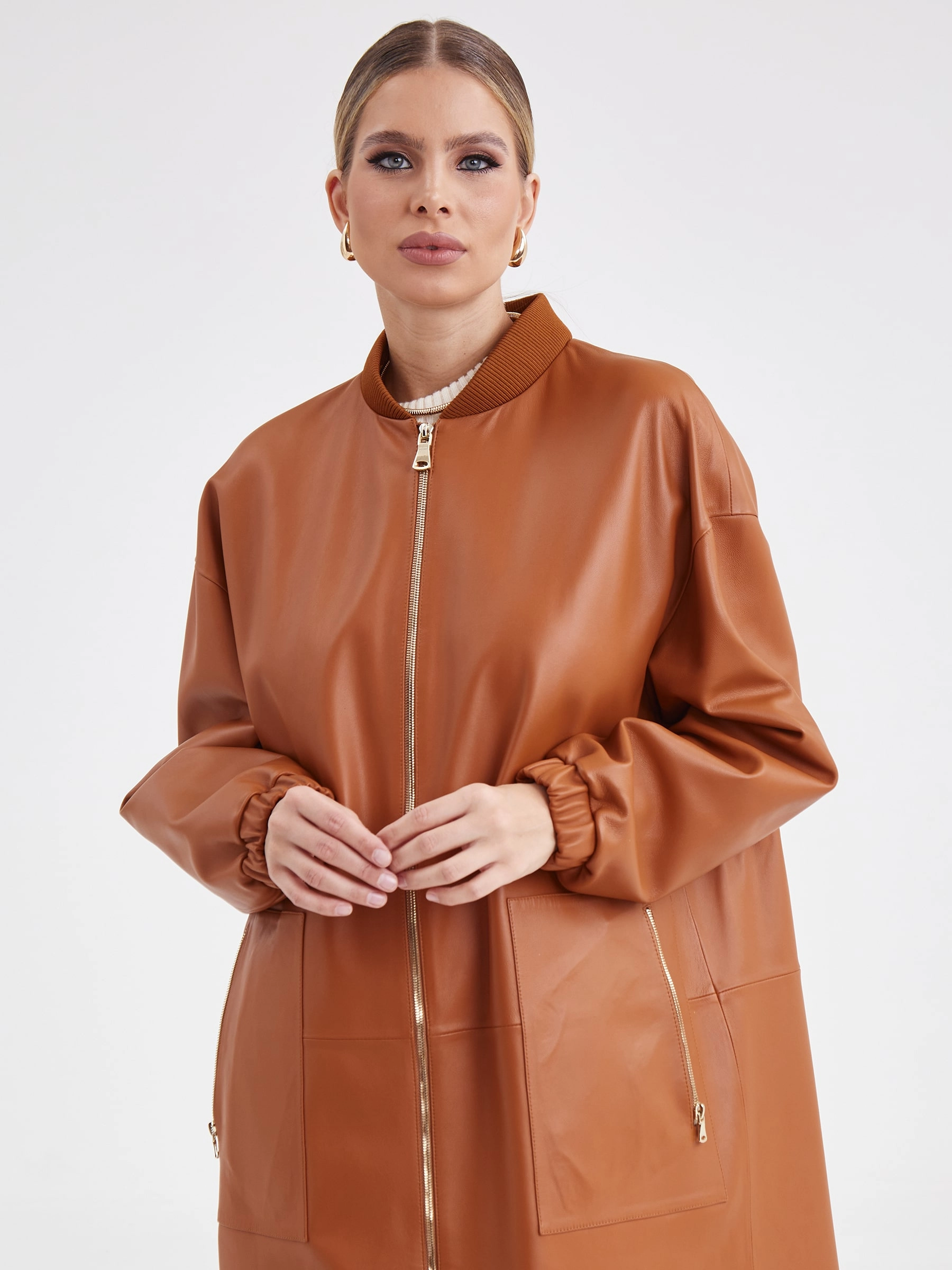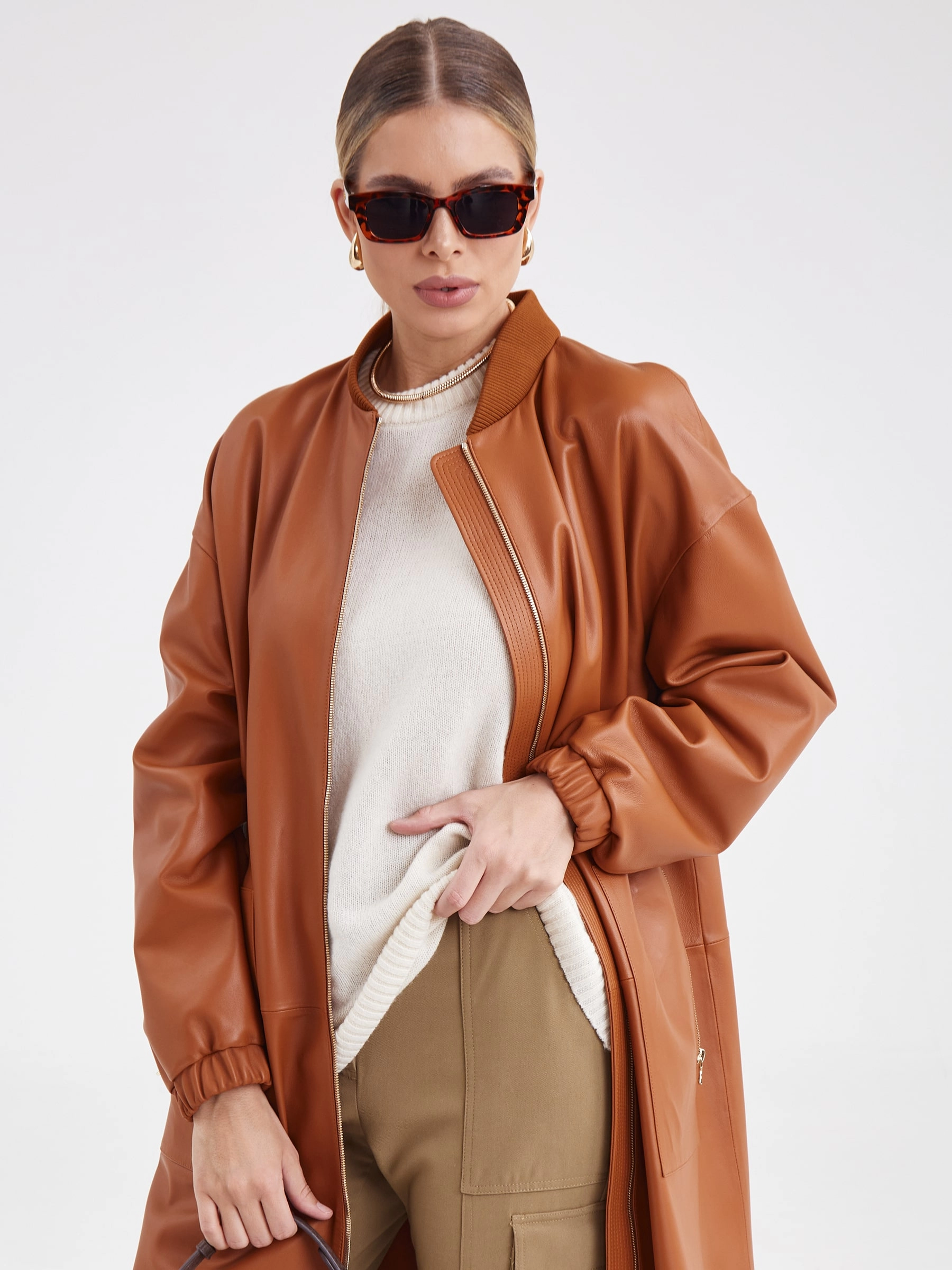Женский кожаный плащ бомбер премиум класса 3035, виски, размер 44, артикул 91931
