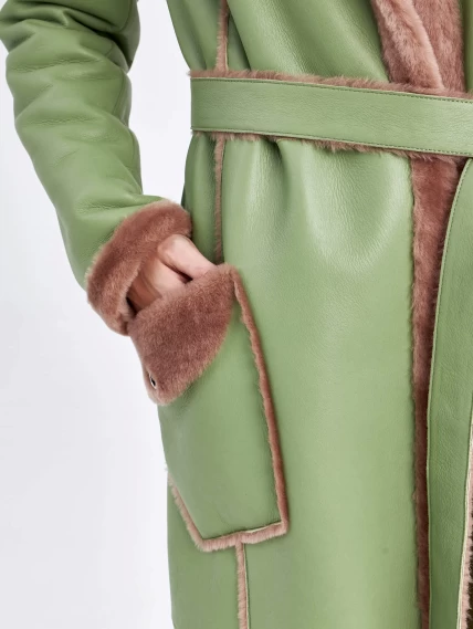 Создавая модель этого пальто из натуральной овчины мастера использовали два цвета: внутренняя -мягкая и нежная овчина в бежевом оттенке, а лицевая - в оливковым. Благодаря бережной выделки изделие получилось легким и теплым. В этой модели есть свой секрет: она не имеет абсолютно никаких застежок - просто запах и длинный пояс. Полуприлегающий силуэт, английский воротник и пара карманов с меховым отворотом застегивающихся на кнопки.