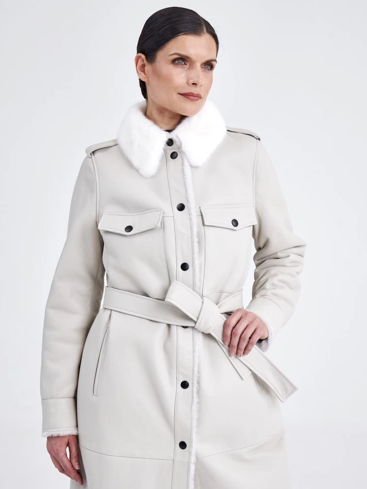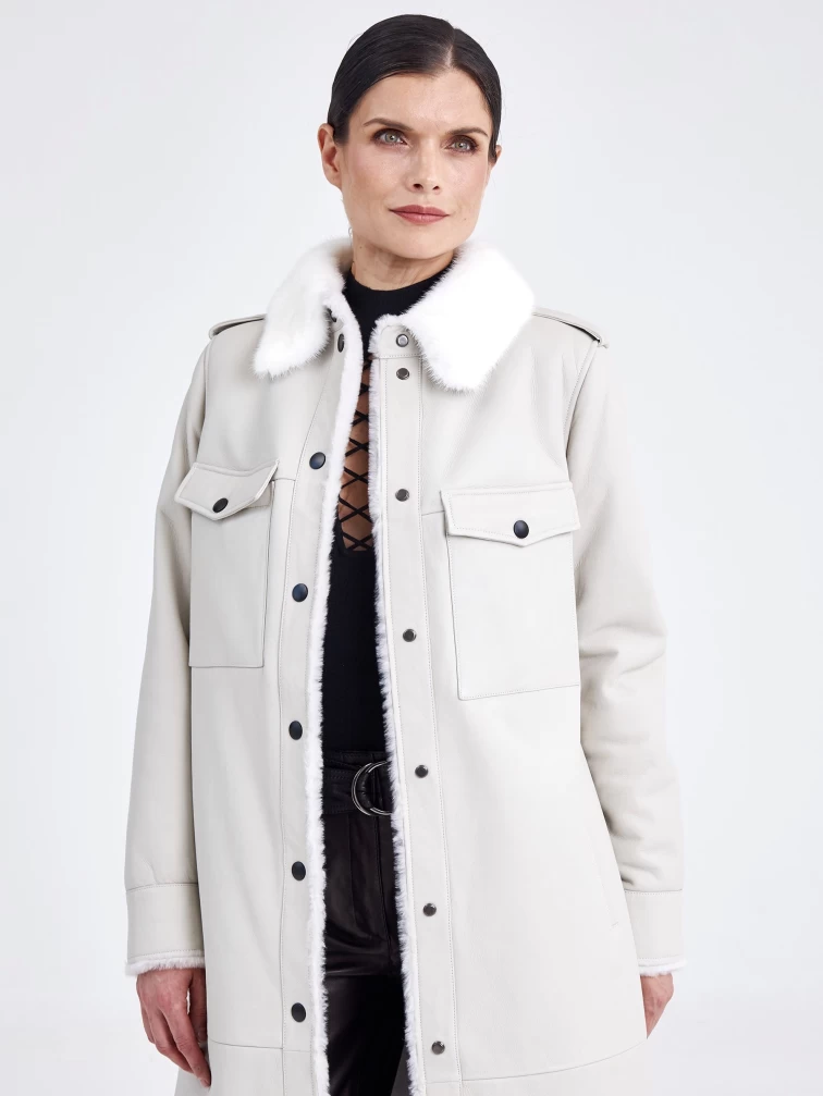 Товар женское пальто рубашка с воротником из меха норки премиум класса 2016, белая, размер 48, артикул 63630 выполнен из овчина "мерино" с застежкой кнопки. Рассчитан на сезон: осень-зима. Длина изделия свыше 90 см, силуэт прямой.