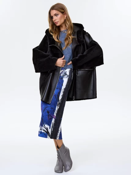 Товар женское полупальто оверсайз из натуральной овчины с капюшоном премиум класса 2055, черное, размер 48, артикул 64270 выполнен из овчина "мерино" с застежкой молния. Рассчитан на сезон: осень-зима. Длина изделия 80 см, силуэт свободный.