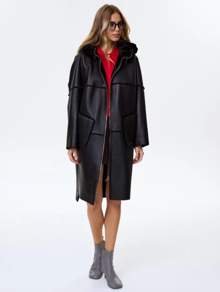 Товар женское полупальто с капюшоном из натуральной овчины премиум класса 2052, черное, размер 52, артикул 64290 выполнен из овчина "мерино" с застежкой молния. Рассчитан на сезон: осень-зима. Длина изделия 105 см, силуэт свободный.