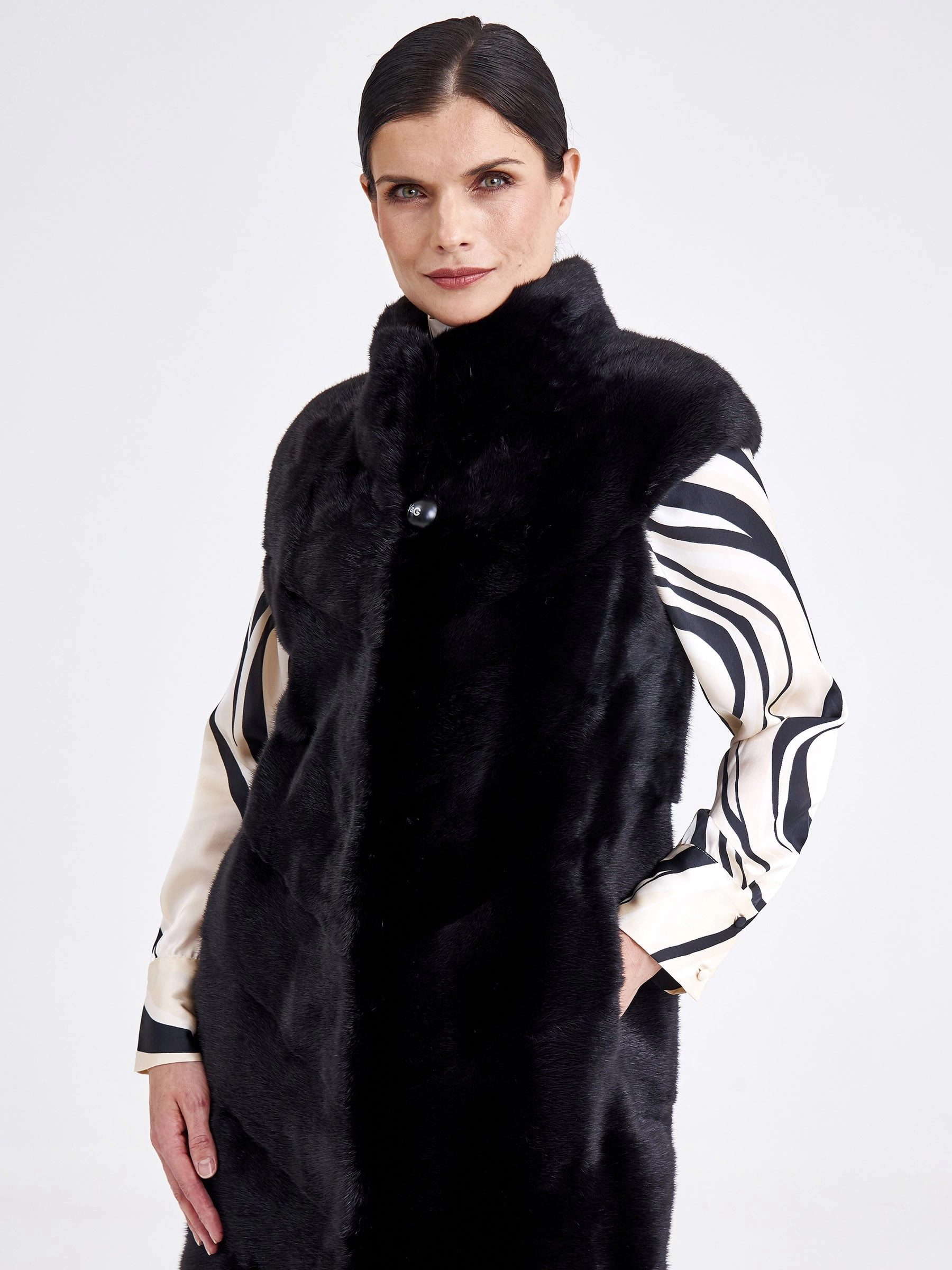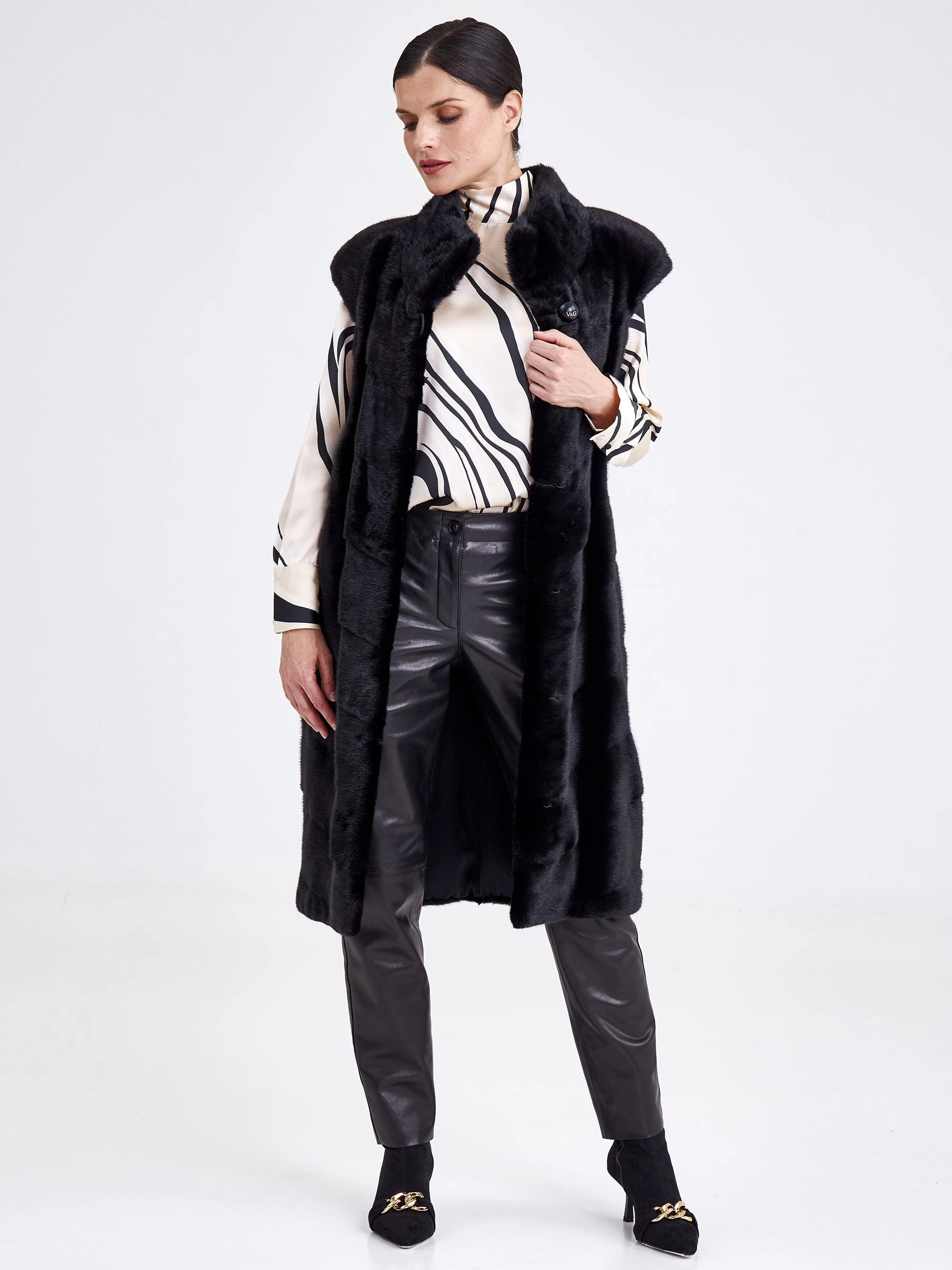 Длинный жилет-это отличное дополнение к образу. Изделие сшили из нежного густого меха норки. Универсальный черный цвет, прямой крой, миниум фурнитуры и полное отсутствие декора. Горизонтальная раскладка меха.Идеальное сочетание с кожаными брюками,юбкой.
