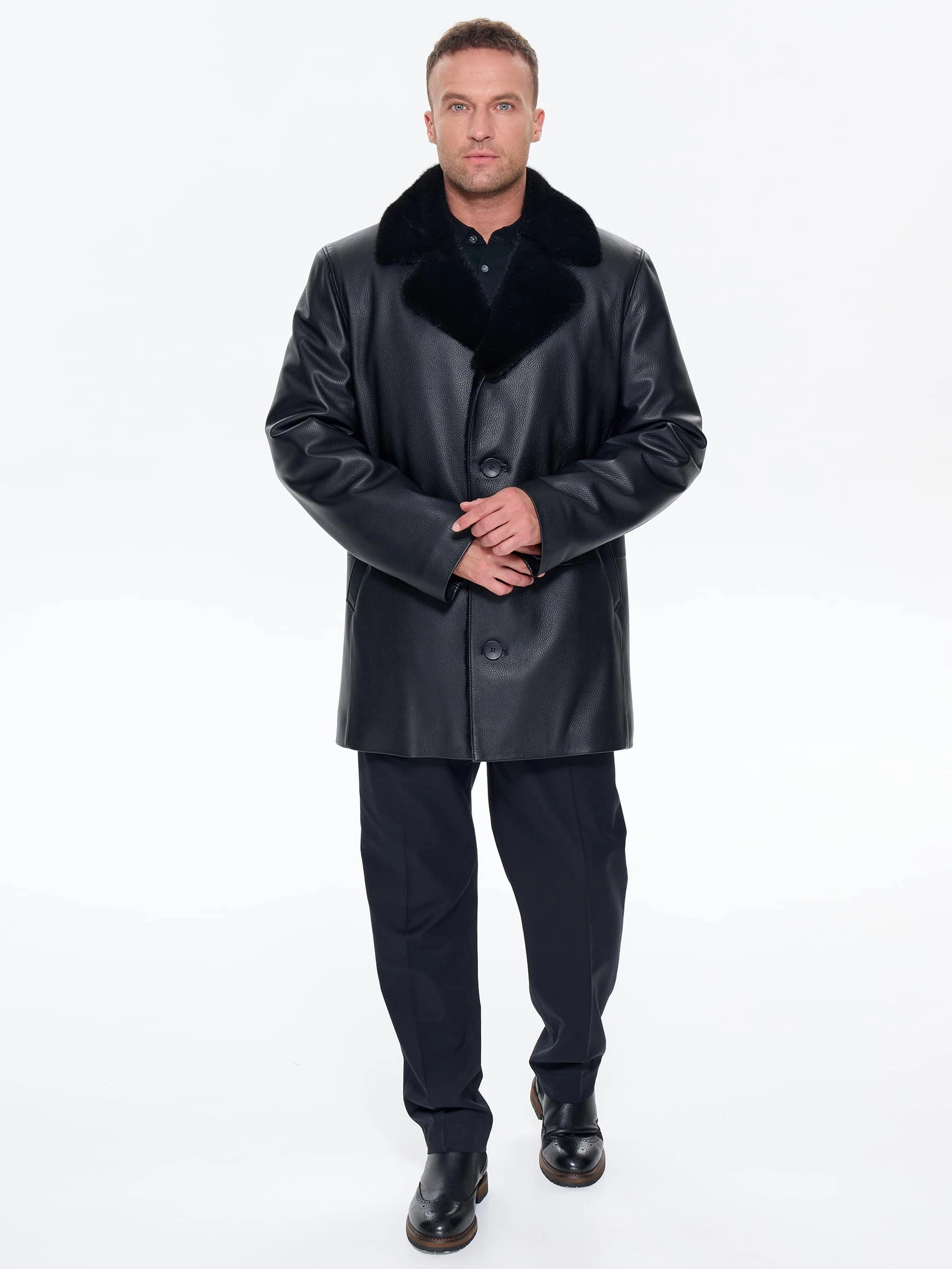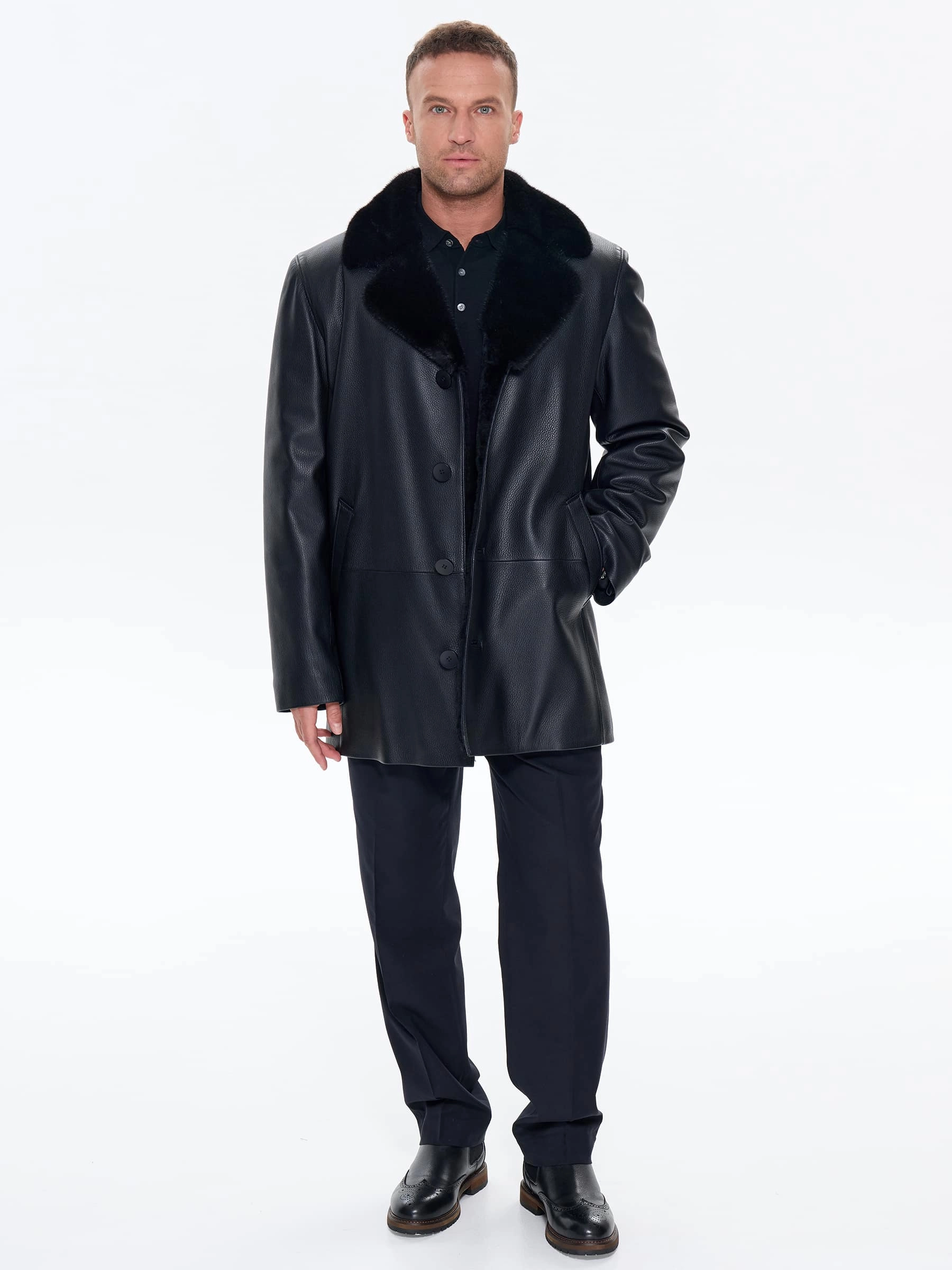 Зимняя кожаная куртка с норковым воротником для мужчин премиум класса 21/1мех, черная, размер 50, артикул 41170
